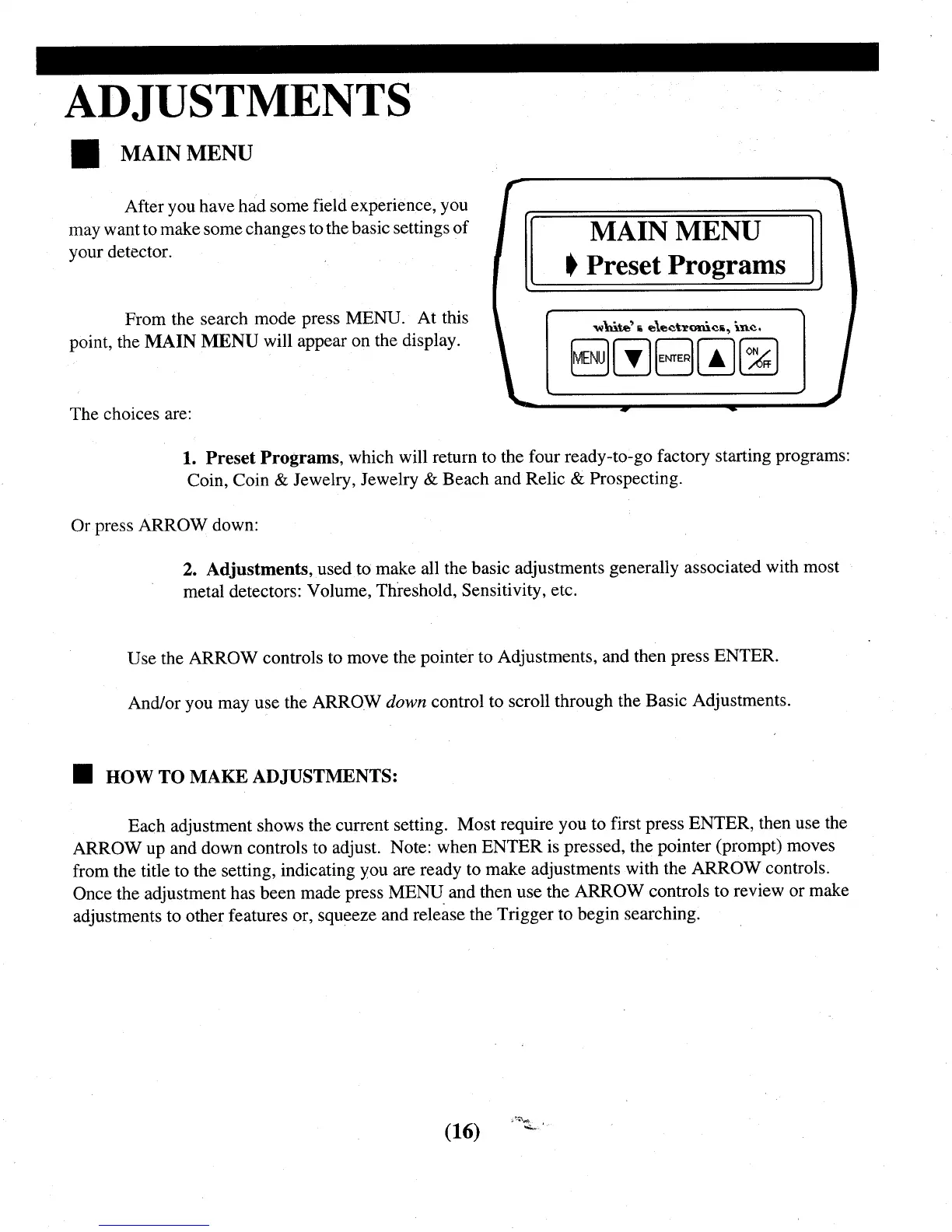 Whites Quantum XT - Adjustments; Main Menu; How to Make Adjustments