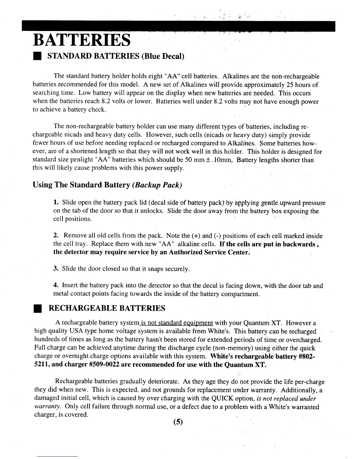 Whites Quantum XT - Batteries; Using the Standard Battery; Rechargeable Batteries