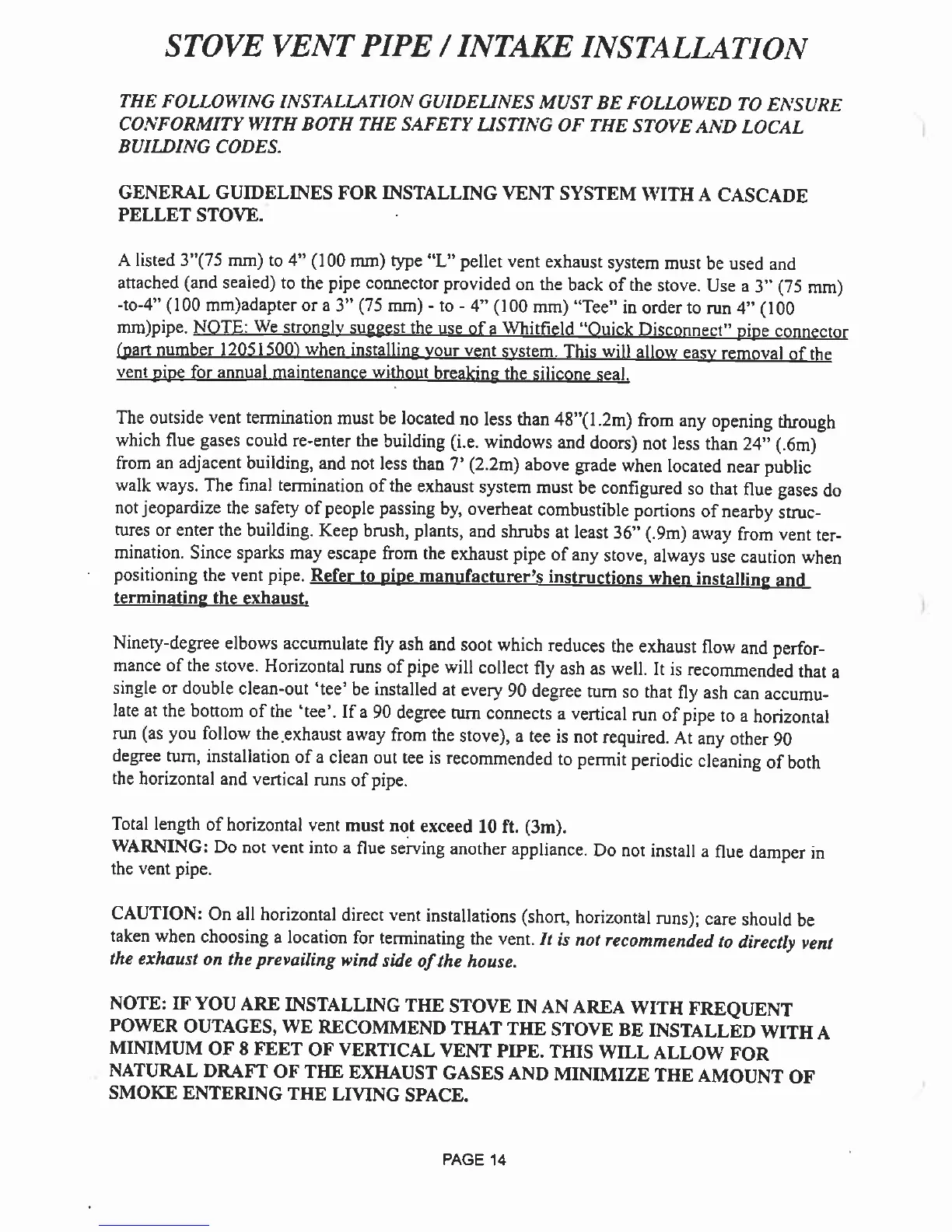 Whitfield Cascade - Stove Vent Pipe;Intake Installation