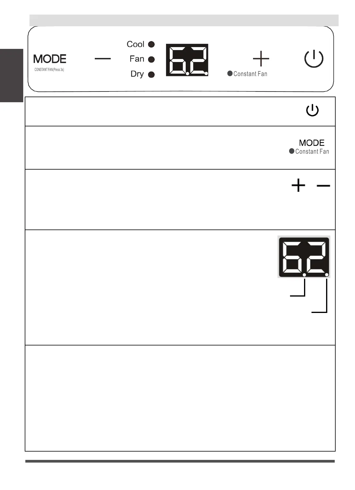Note: In Cooling or Dry mode, press the Mode for 3 seconds to turn the Constant Fan function on or off. When the function is turned on, the Constant Fan light will illuminate, identifying