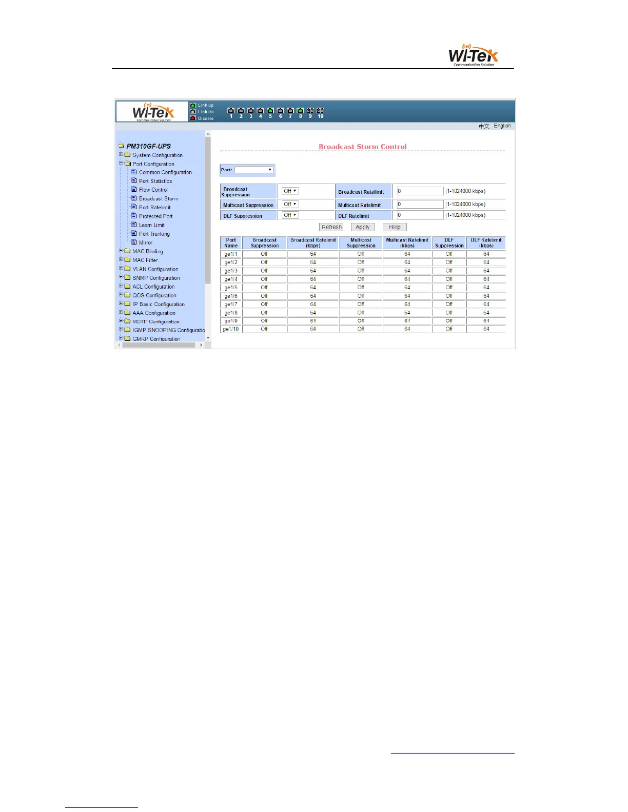Figure 22 shows the port rate limit page。This page is used to configure the rate at which