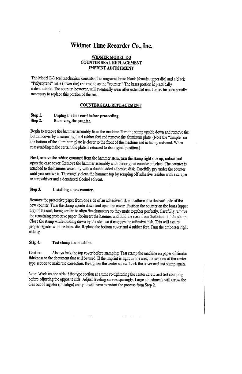 widmer E-3 - Counter Seal Replacement and Imprint Adjustment; Removing the Counter Seal; Installing a New Counter Seal; Testing Imprint Quality