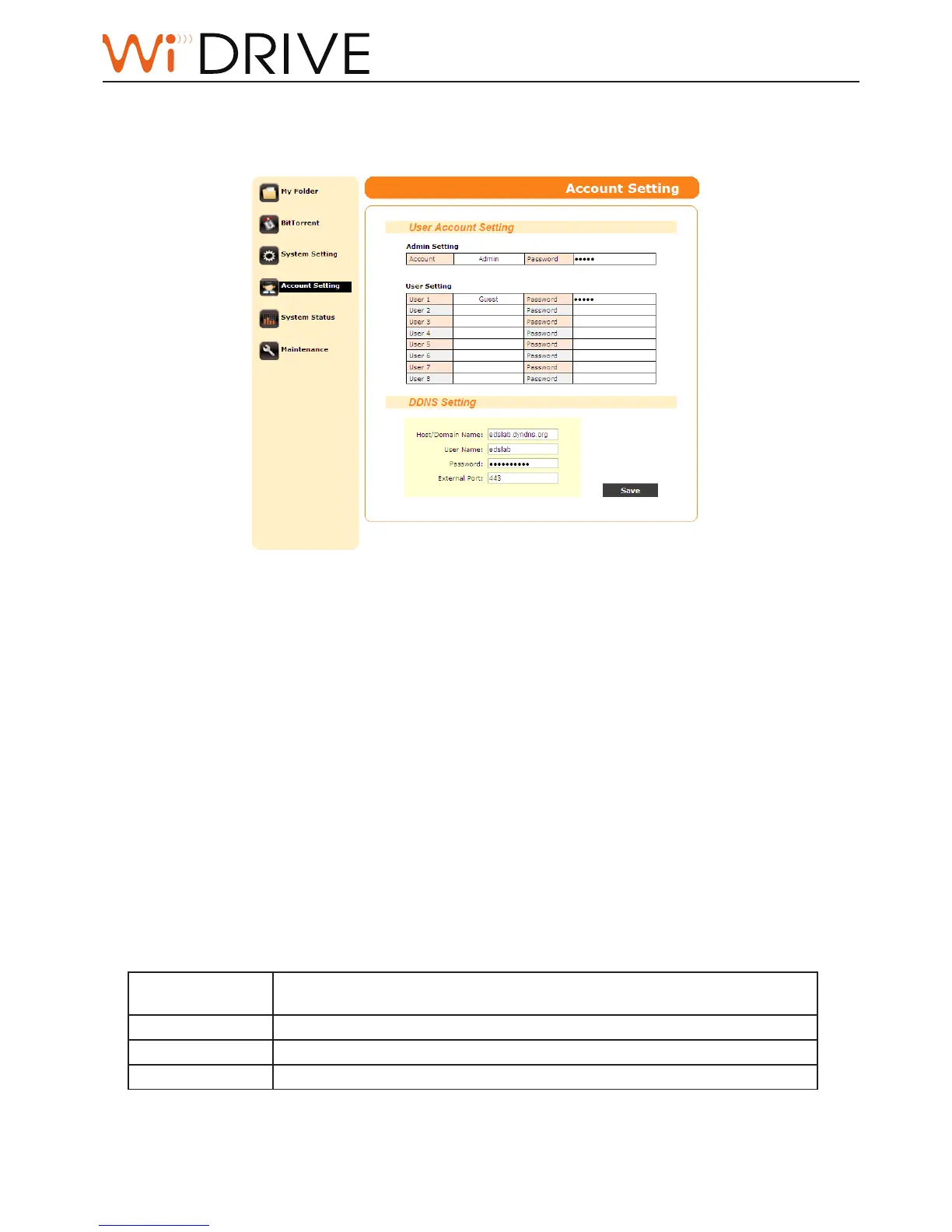 In the Account Seng page you can manage accounts and setup DDNS. Click on Save buon to save
