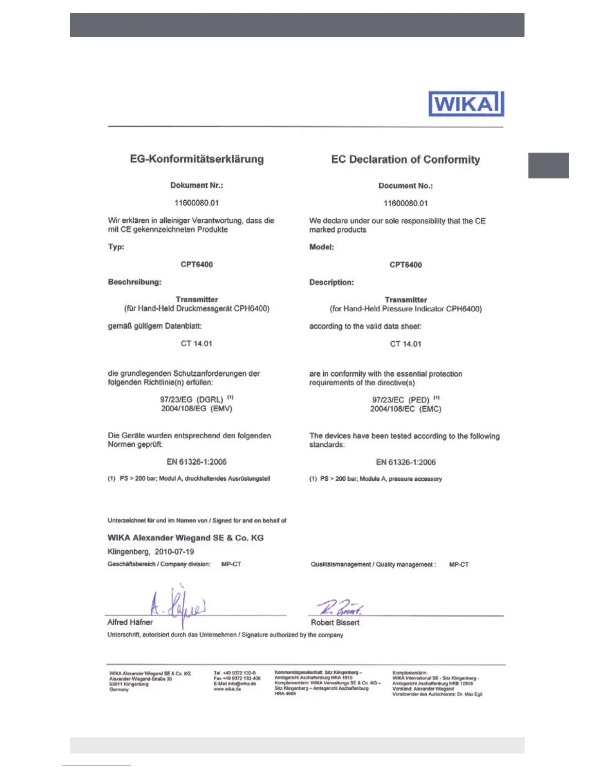 WIKA CPH6400 - Anlage 2: EG-Konformitätserklärung Typ CPT6400
