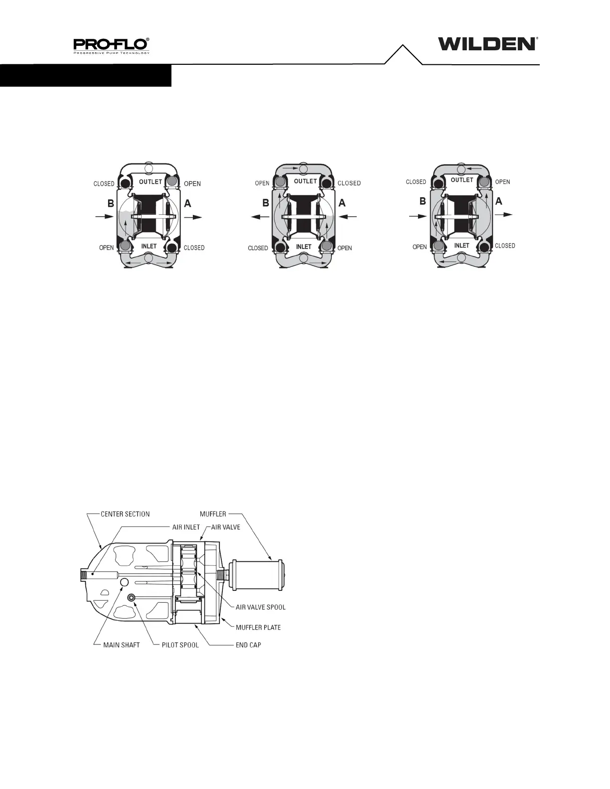 The Wilden diaphragm pump is an air-operated, positive displacement, self-priming pump. These drawings show flow pattern through the pump