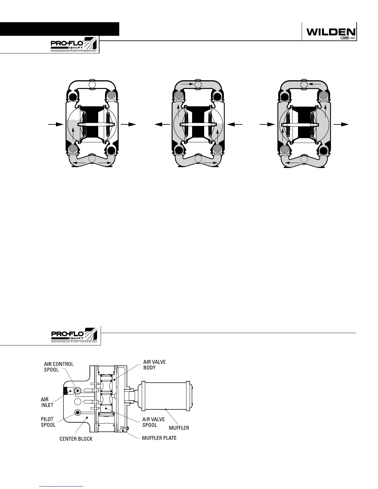 The Wilden diaphragm pump is an air-operated, positive displacement, self-priming pump. These drawings show flow pattern