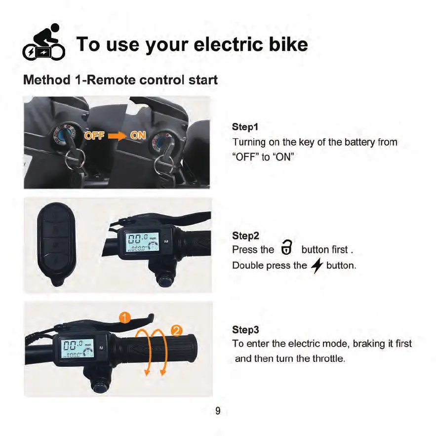 WILDEWAY X7 - Operating Your Electric Bike; Method 1: Remote Control Start