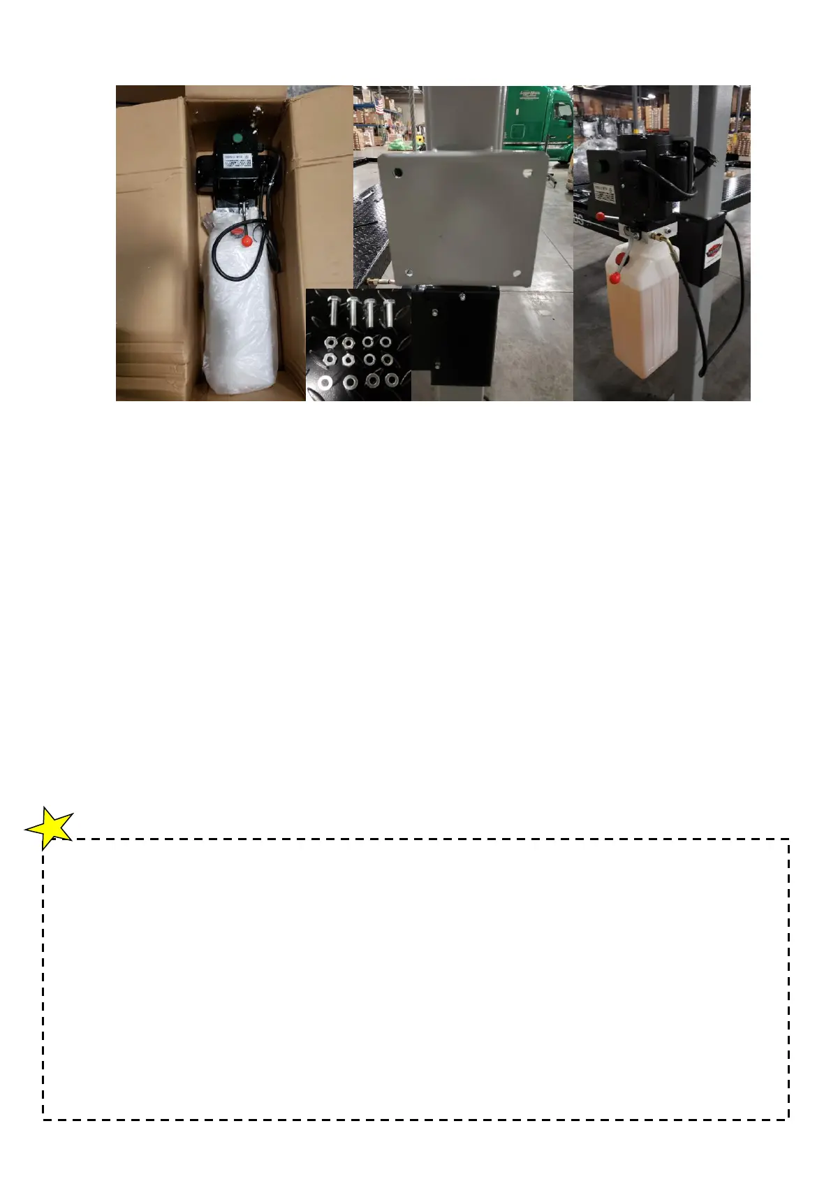 filled once mounted to the lift. Use the power unit mounting bolts, flat washers and lock
