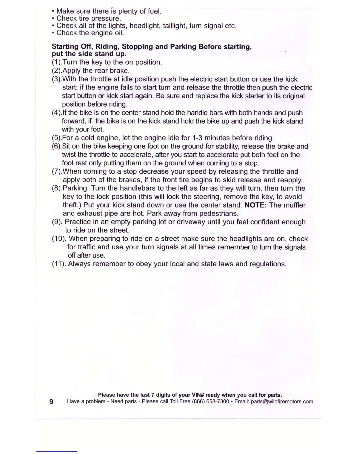 Wildfire WFH50-S2E - Starting, Riding, Stopping, and Parking; Pre-Operation Checks; Starting the Engine; Riding and Stopping Techniques