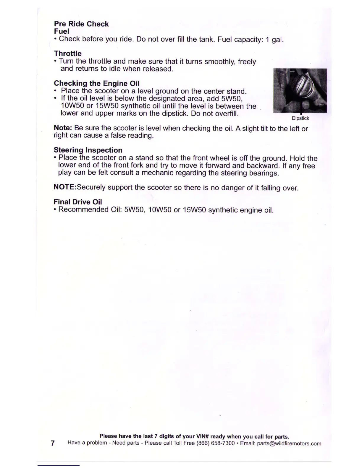 Wildfire WFH50-S2E - Pre-Ride Inspections; Fuel and Throttle Check; Engine Oil Level Verification