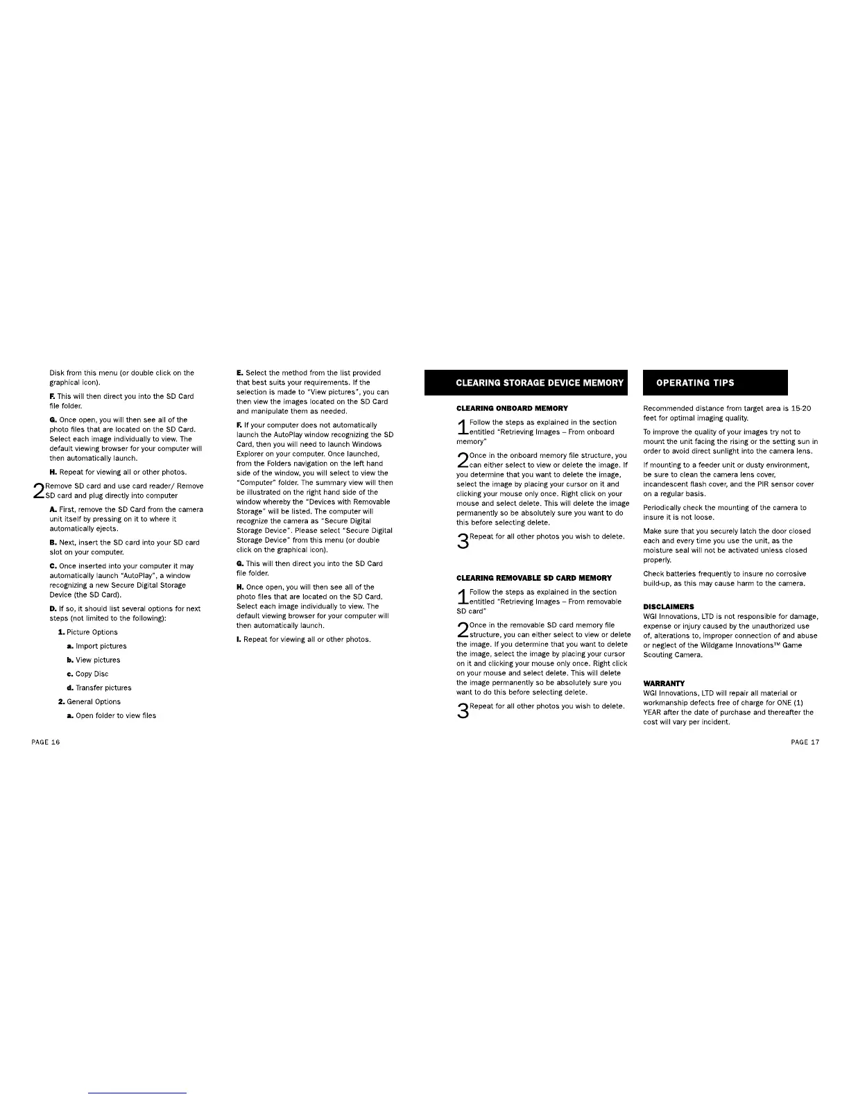 Wildgame X6C - Clearing Storage Device Memory; Clearing Onboard Memory; Clearing SD Card Memory; Operating Tips