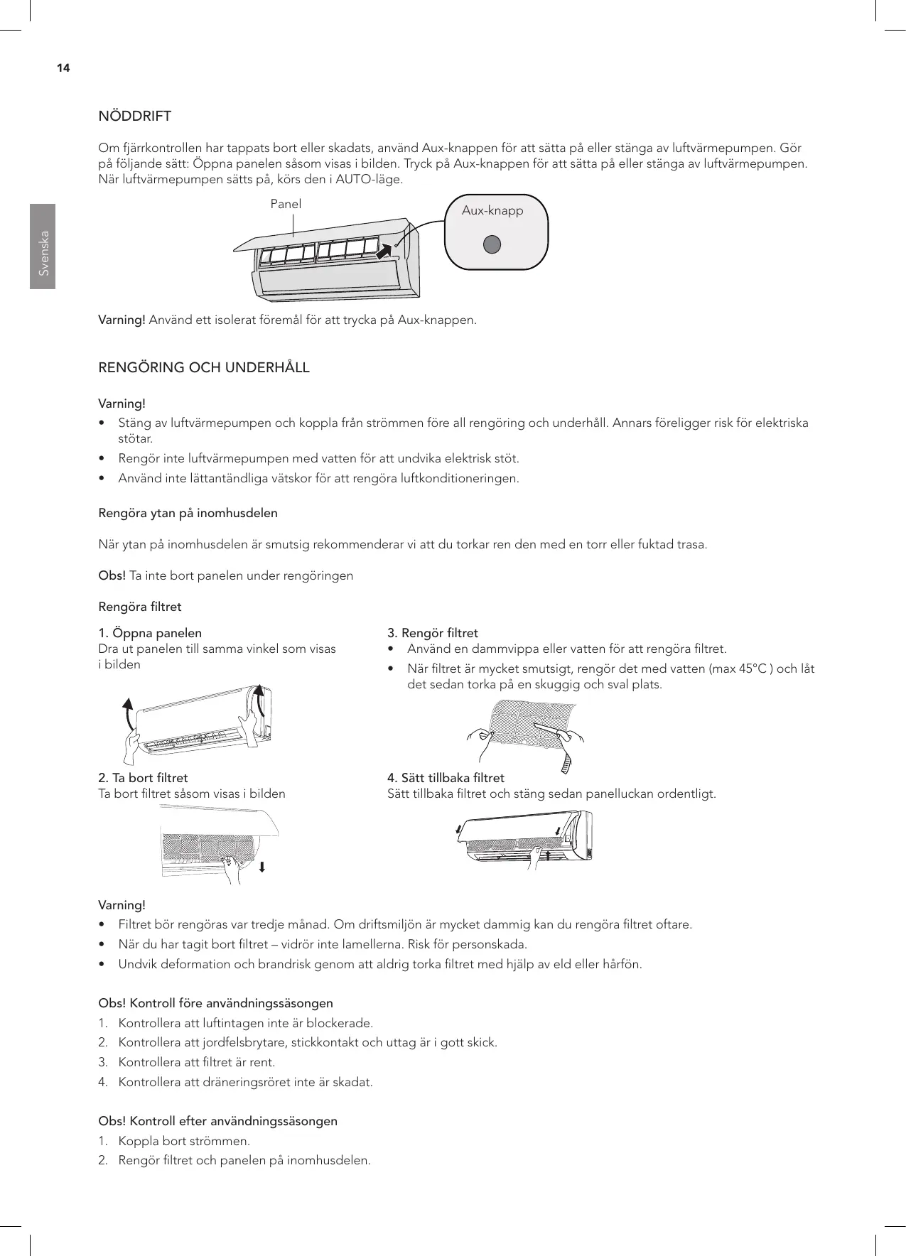 • Stäng av luftvärmepumpen och koppla från strömmen före all rengöring och underhåll. Annars föreligger risk för elektriska