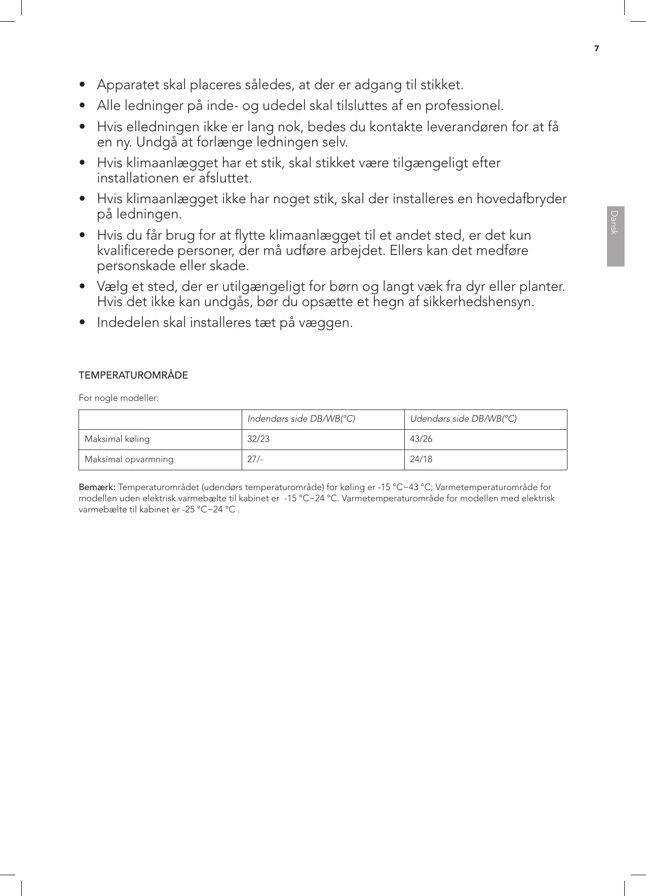 Bemærk: Temperaturområdet (udendørs temperaturområde) for køling er -15 °C~43 °C; Varmetemperaturområde for