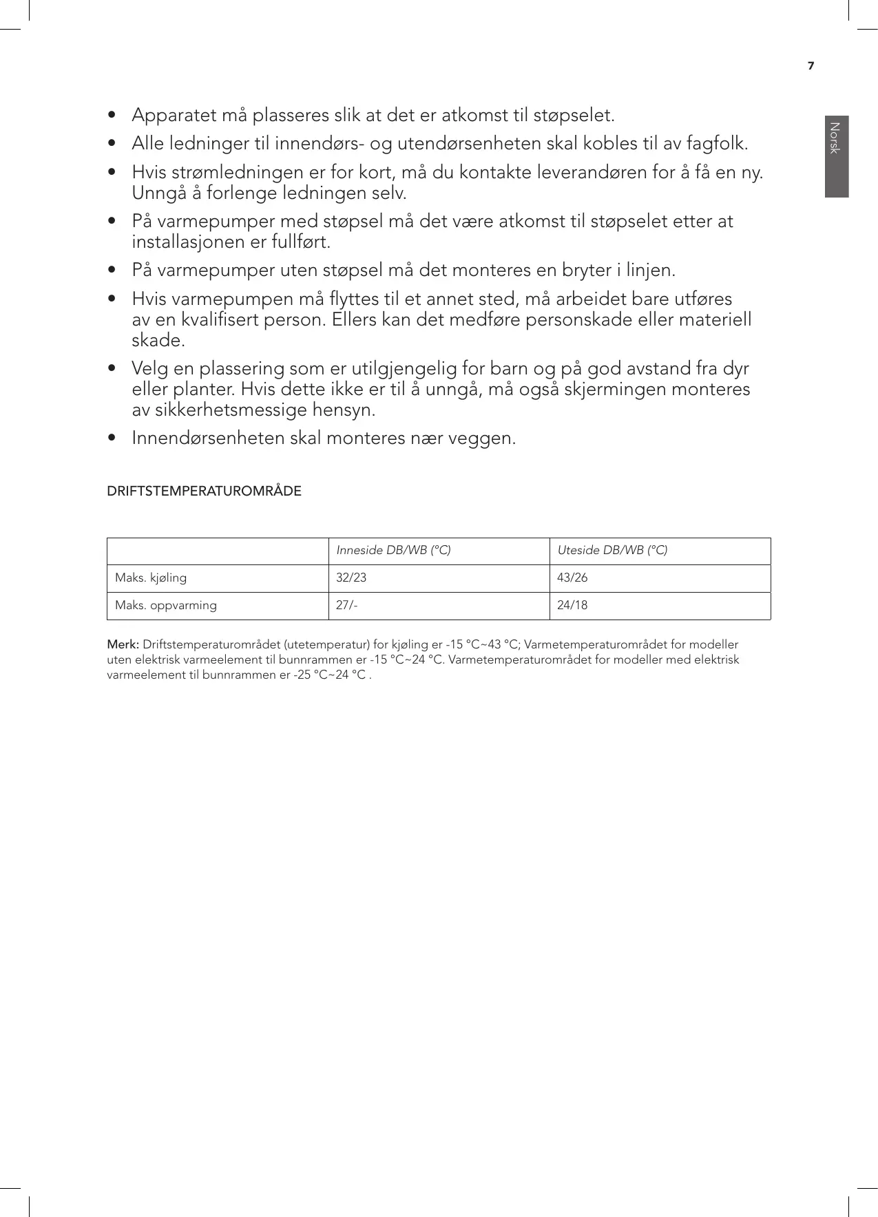 Merk: Driftstemperaturområdet (utetemperatur) for kjøling er -15 °C~43 °C; Varmetemperaturområdet for modeller