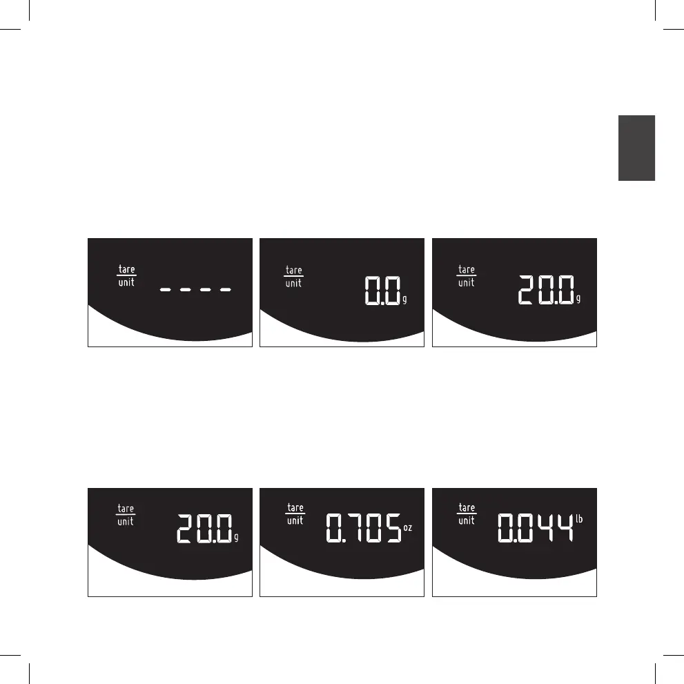 • Trykk og hold inne "tare/unit"-knappen i 1 sekund. Tallene vil forsvinne og enheten vil