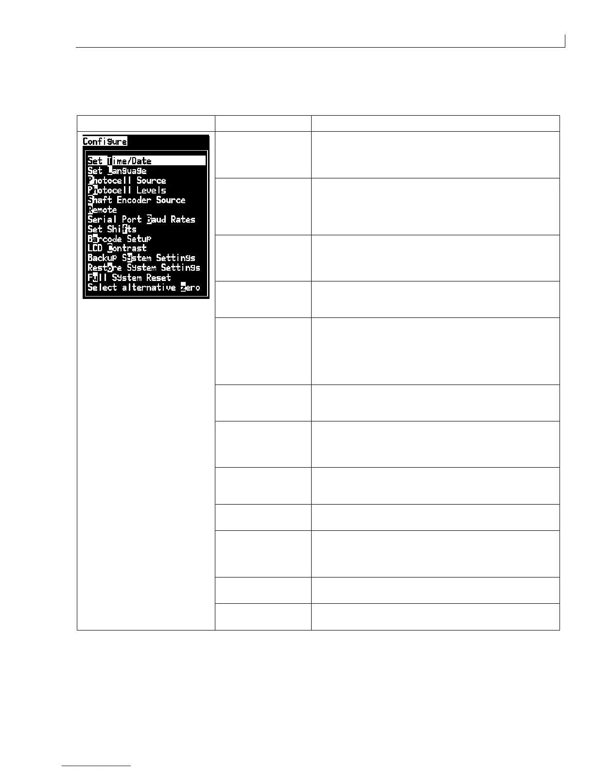Configure Menu Menu Option Function