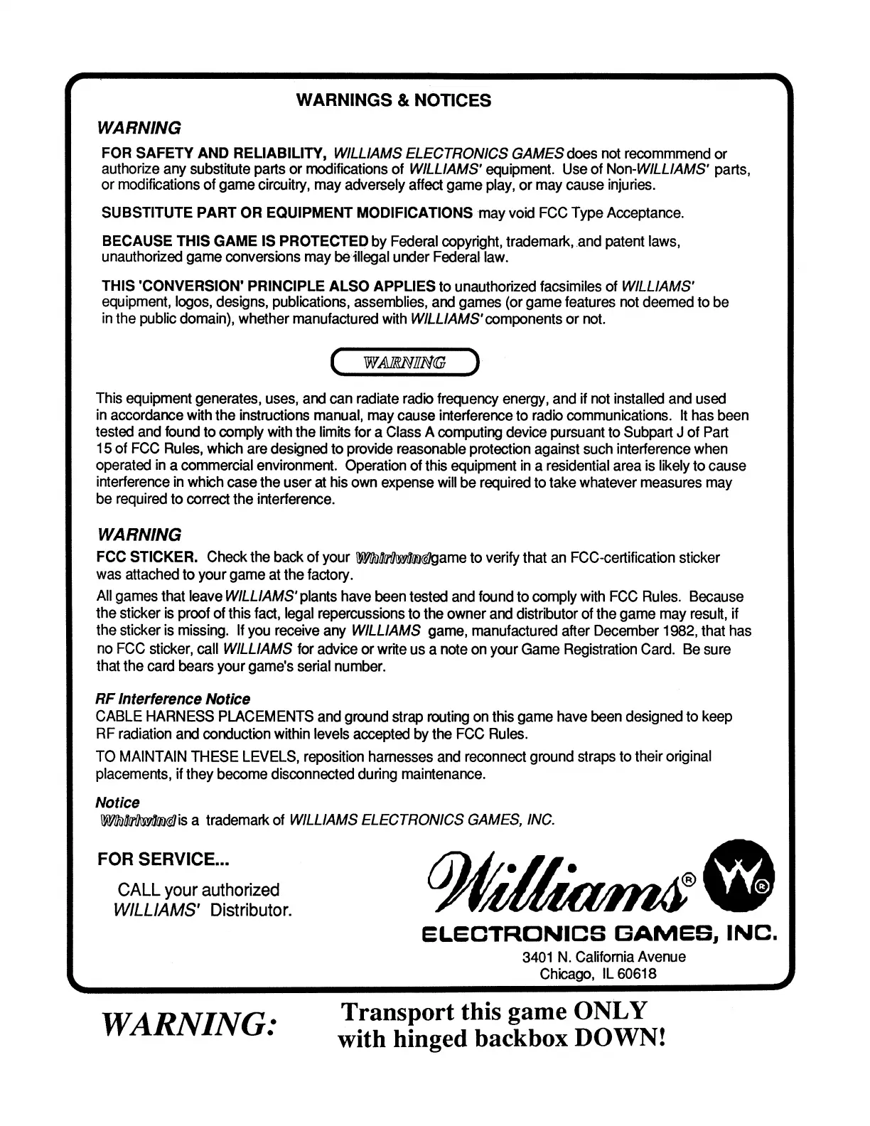 Williams Electronics WHIRLWIND - Warnings & Notices