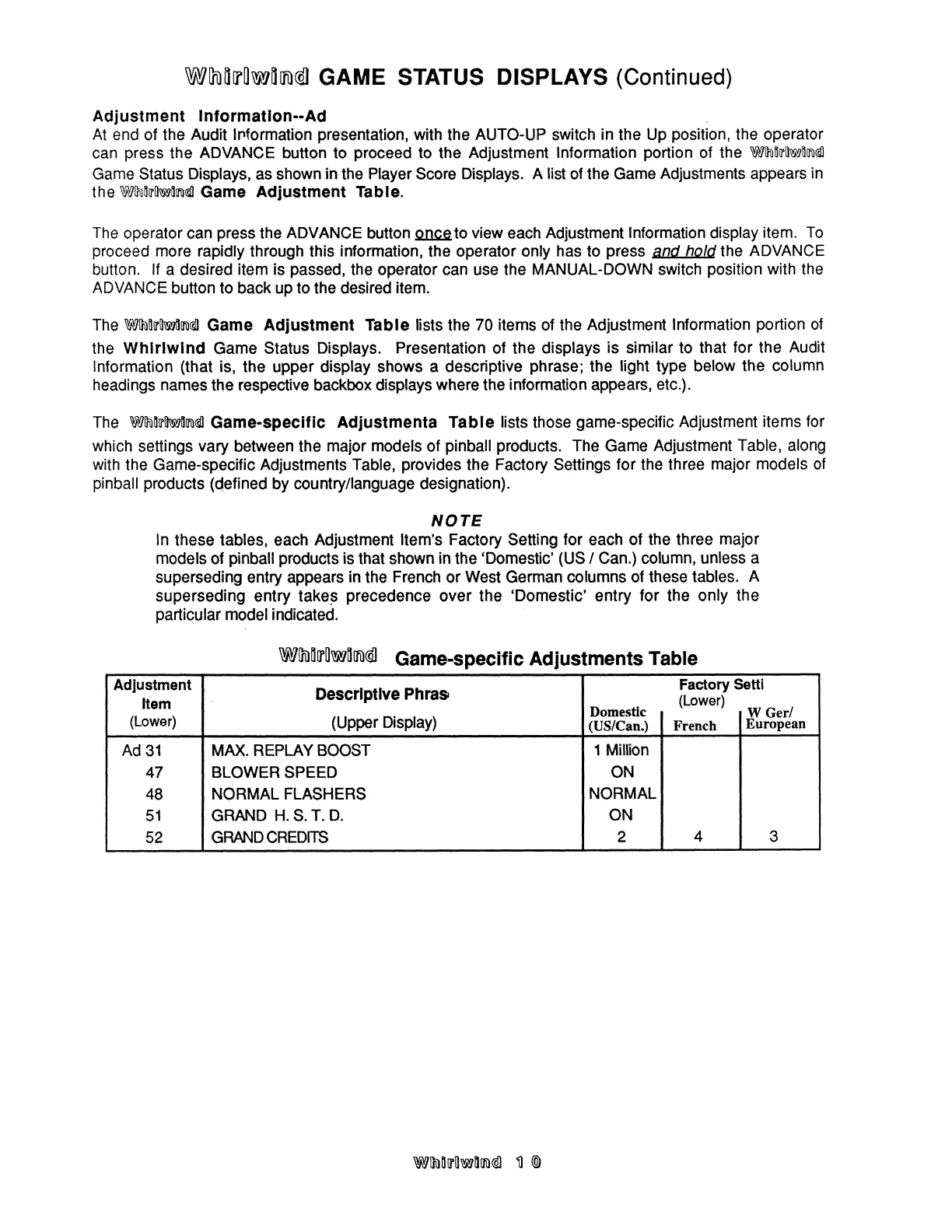 Williams Electronics WHIRLWIND - Game-specific Adjustments Table