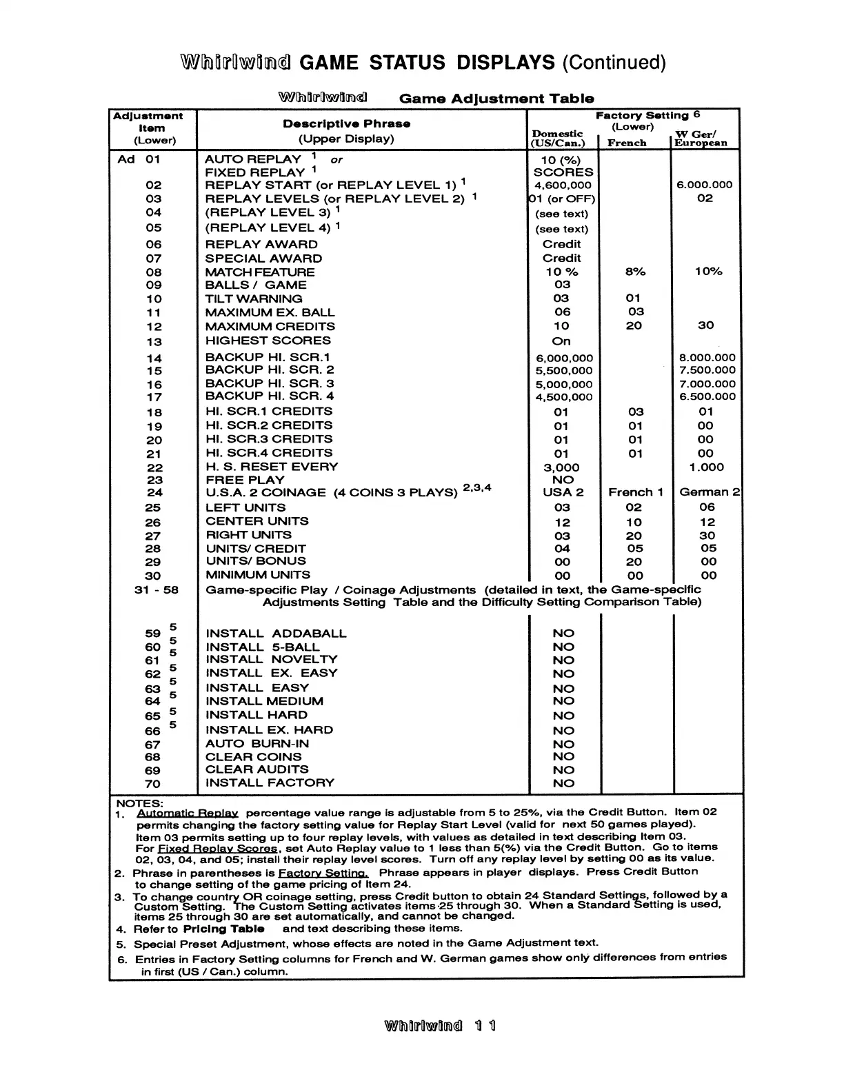 Williams Electronics WHIRLWIND - Game Adjustement Table