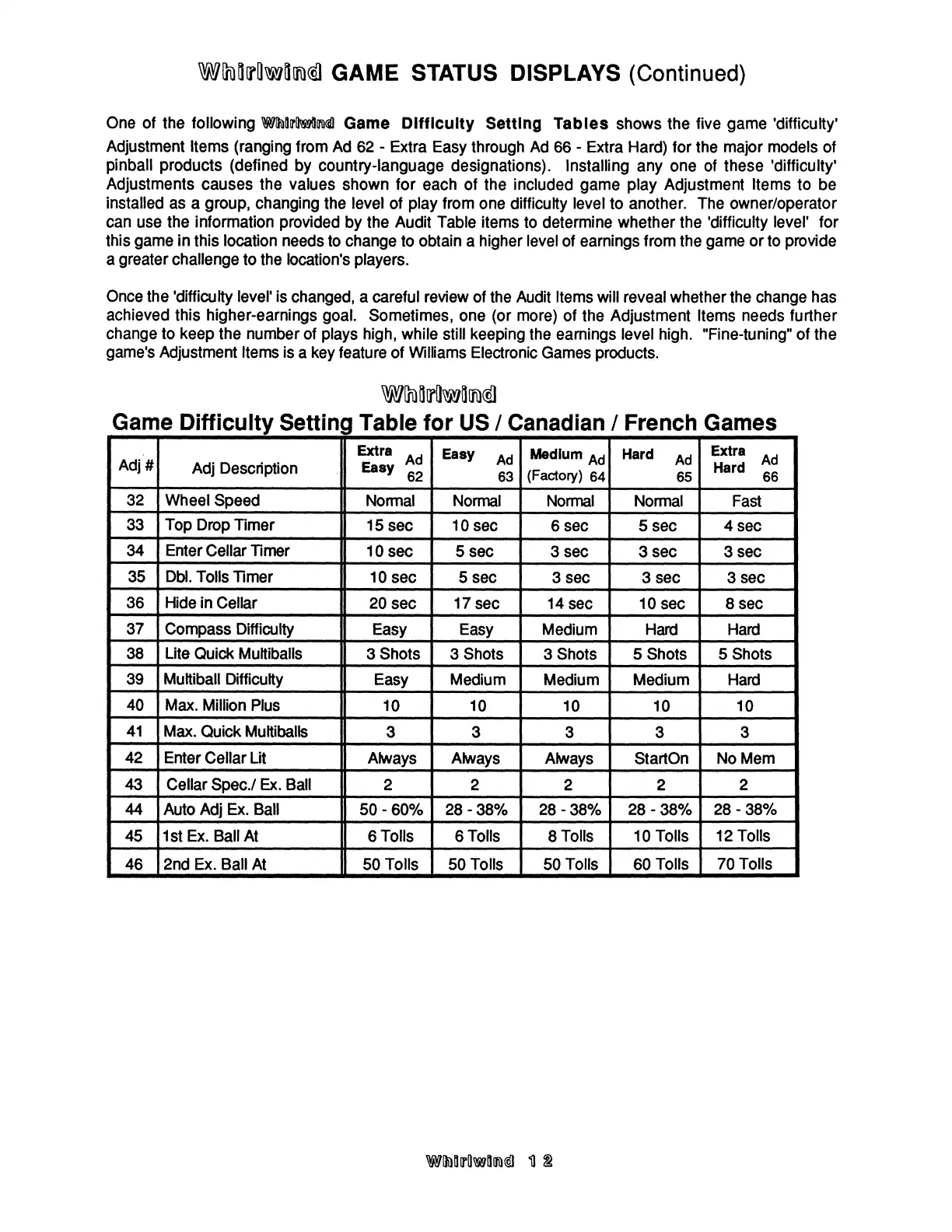 Williams Electronics WHIRLWIND - Game Difficulty Setting Tables; US; Canadian; French Games