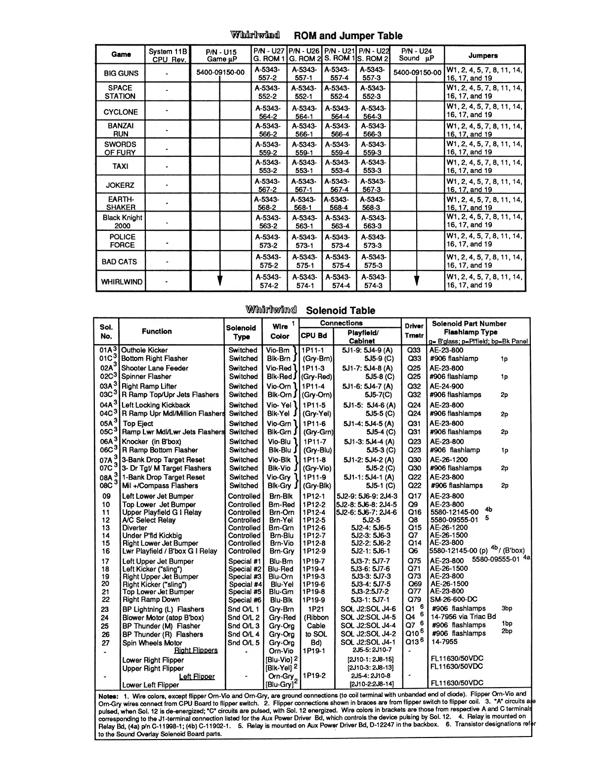 Williams Electronics WHIRLWIND - ROM and Jumper Table; Solenoid Table