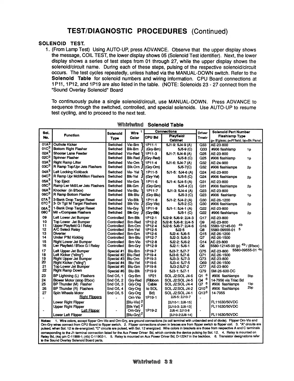 Williams Electronics WHIRLWIND - Solenoid Test; Solenoid Table