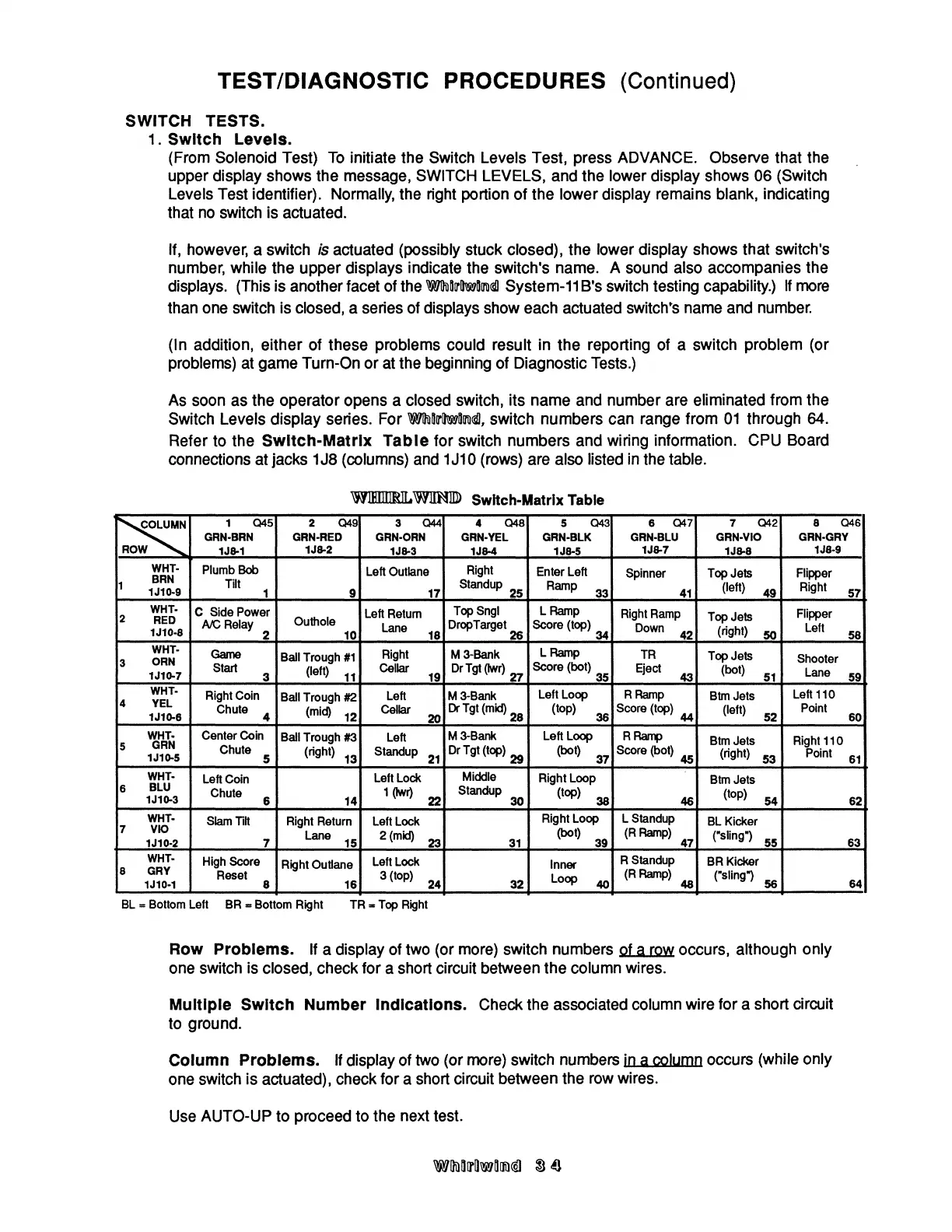 Williams Electronics WHIRLWIND - Switch Tests; Switch-Matrix Table