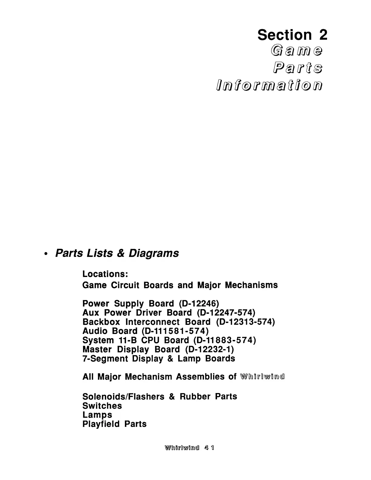 Williams Electronics WHIRLWIND - Section 2 - Game Parts Information