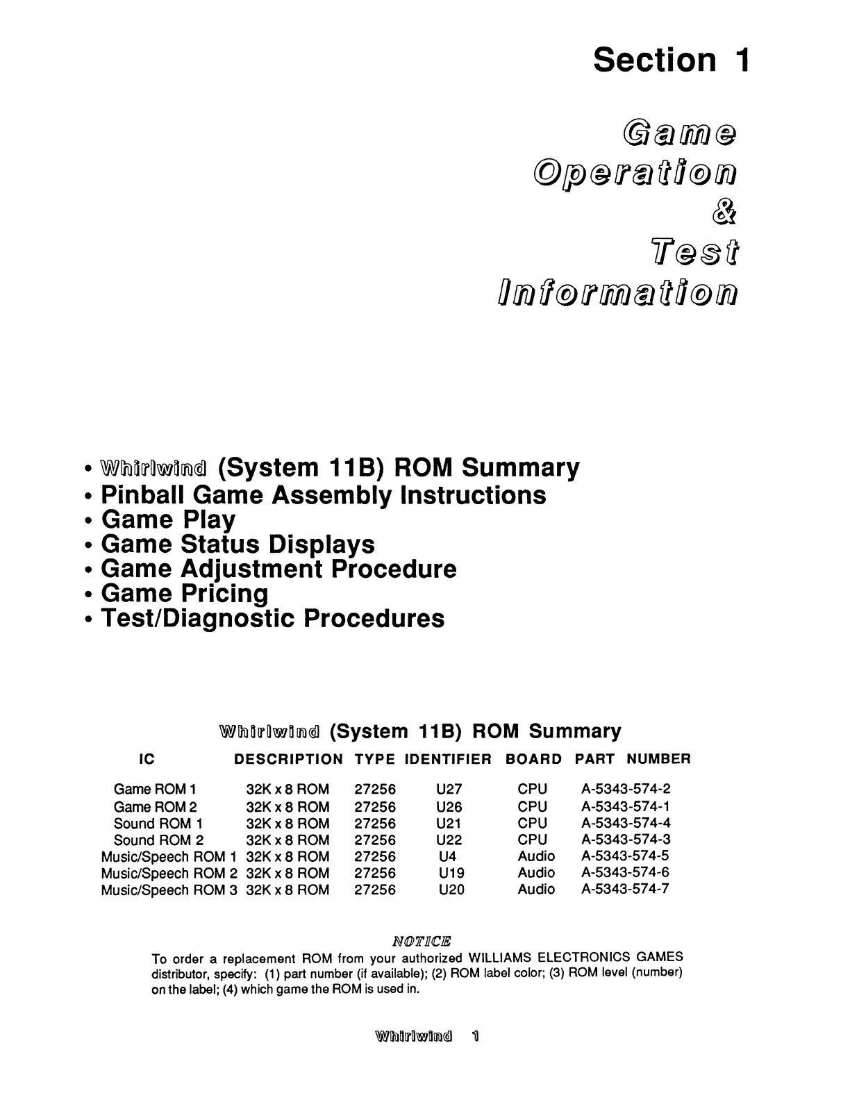 Williams Electronics WHIRLWIND - Section 1 - Game Operation & Test Information