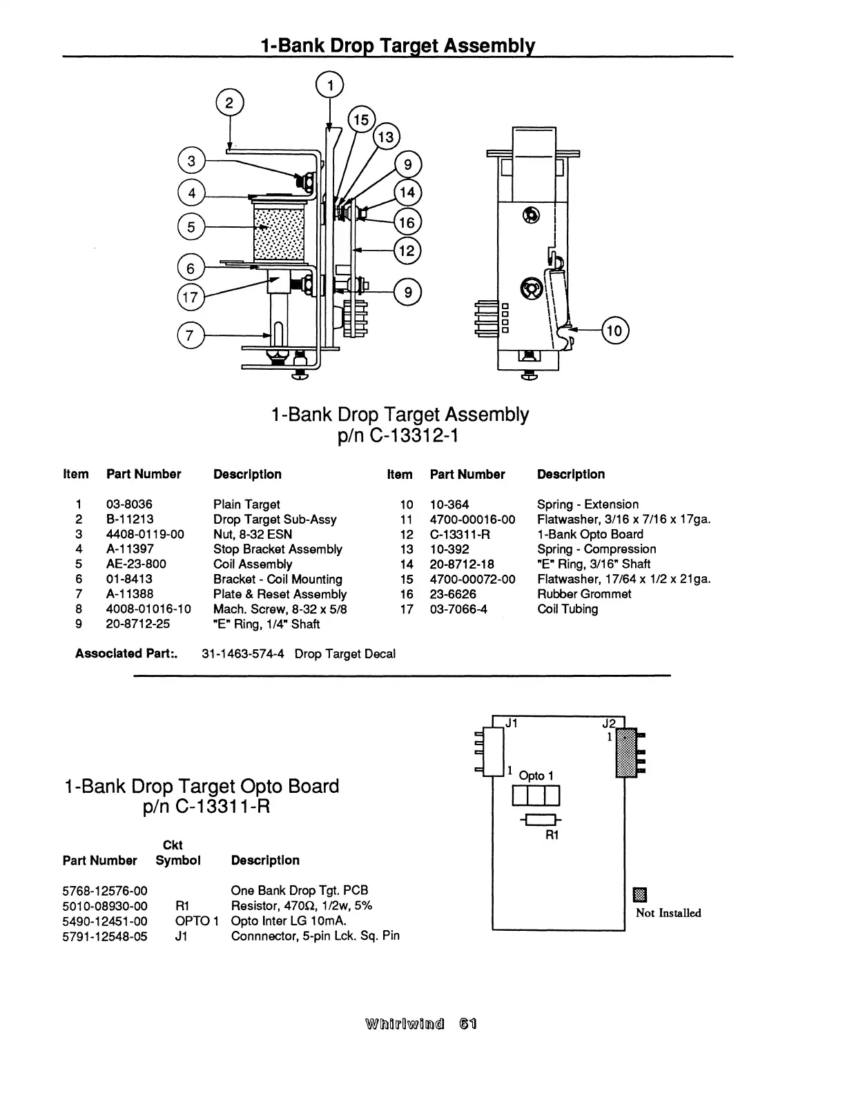 Williams Electronics WHIRLWIND - 1-Bank Drop Target Assembly; 1-Bank Drop Target Opto Board