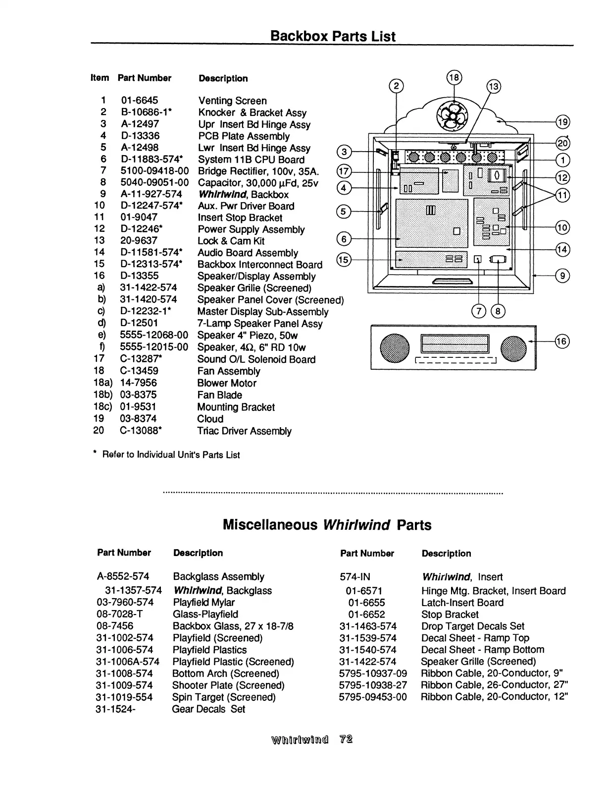 Williams Electronics WHIRLWIND - Backbox Parts List; Miscellaneous Whirlwind Parts