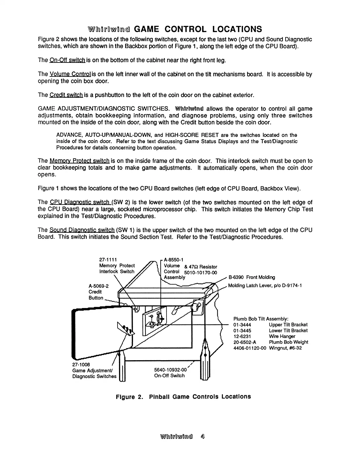 Williams Electronics WHIRLWIND - Game Control Locations; Figure 2. Pinball Game Controls Locations