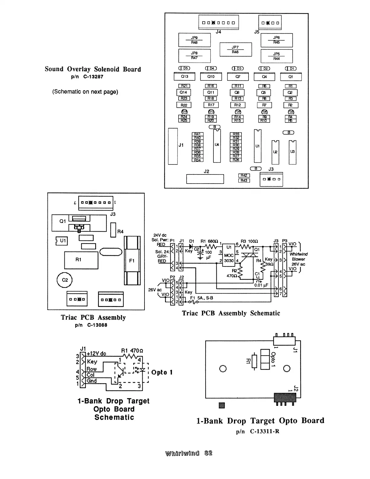 Williams Electronics WHIRLWIND - Sound Overlay Solenoid Board; Layout; Triac PCB Assembly; 1-Bank Drop Target Opto Board