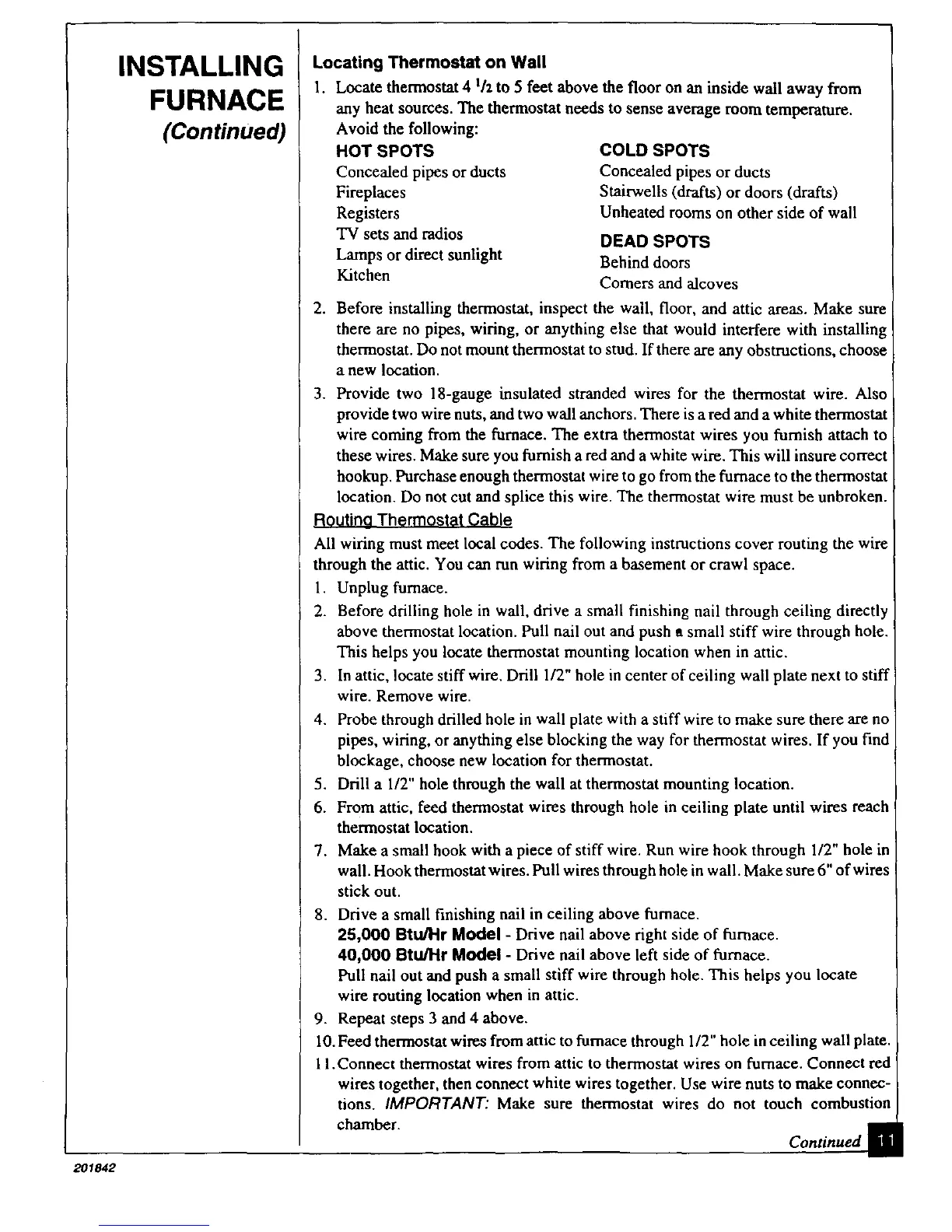 10. Feed thermostat wires from attic to furnace through 1/2" hole in ceiling wall plate.