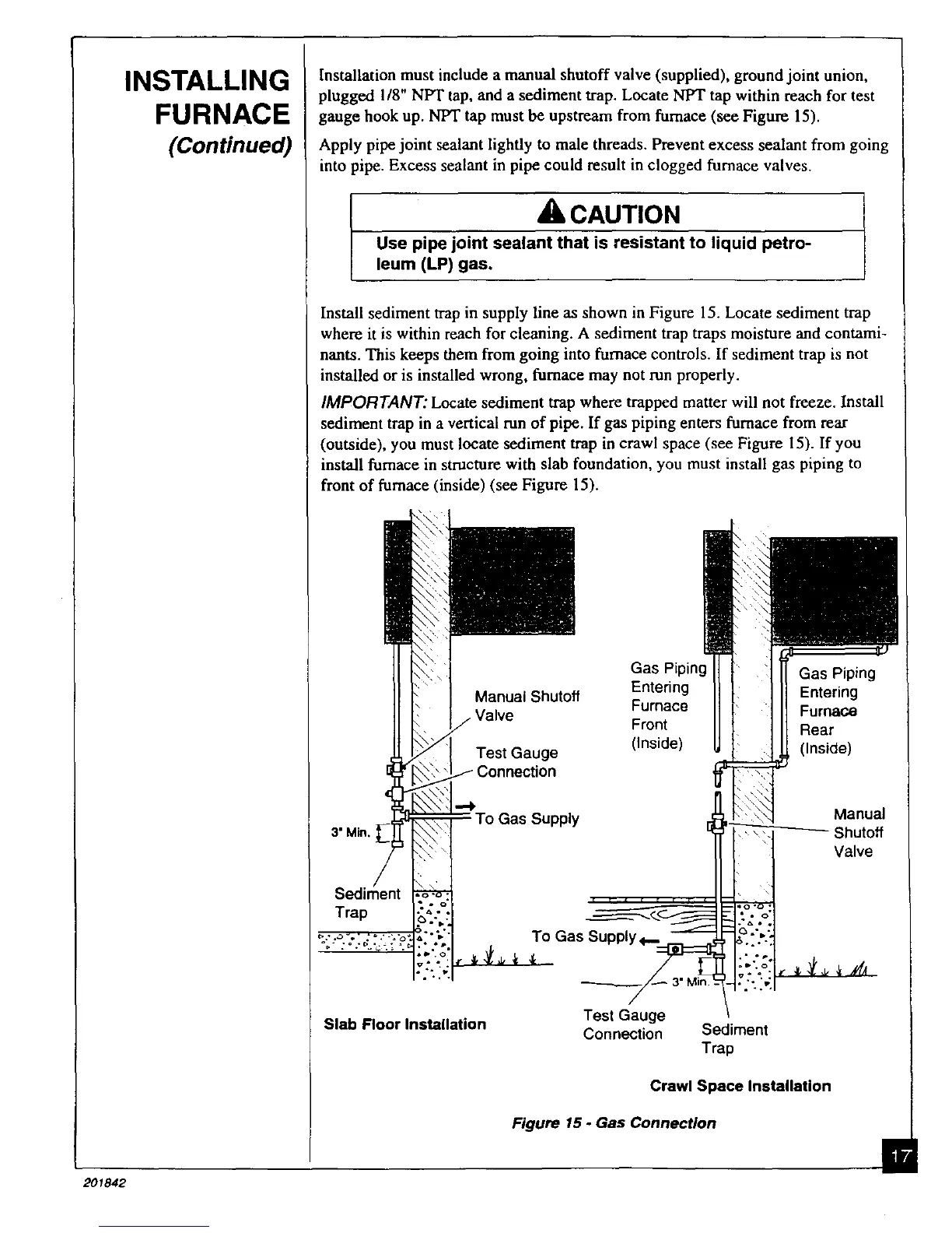 sediment trap in a vertical run of pipe. If gas piping enters furnace from rear