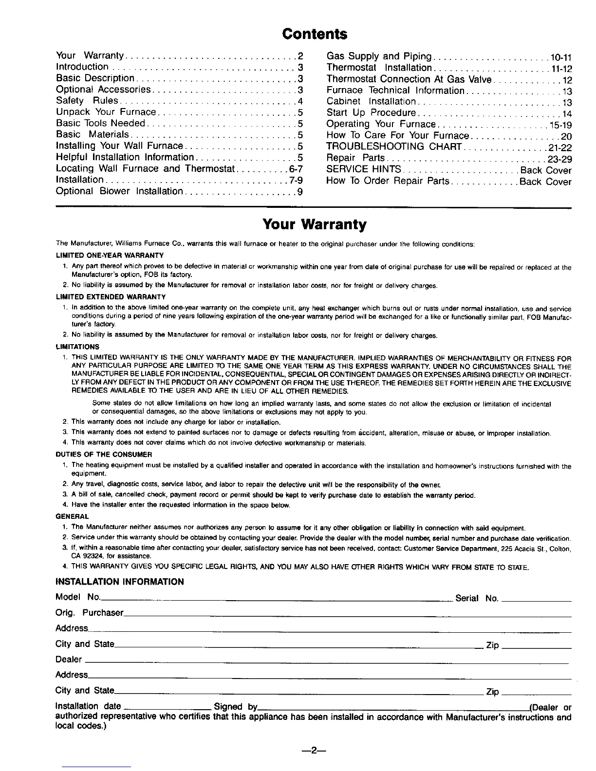The Manufacturer, Williams Furnace Co., warrants this wall furnace or heater to the original purchaser under the following conditions:
