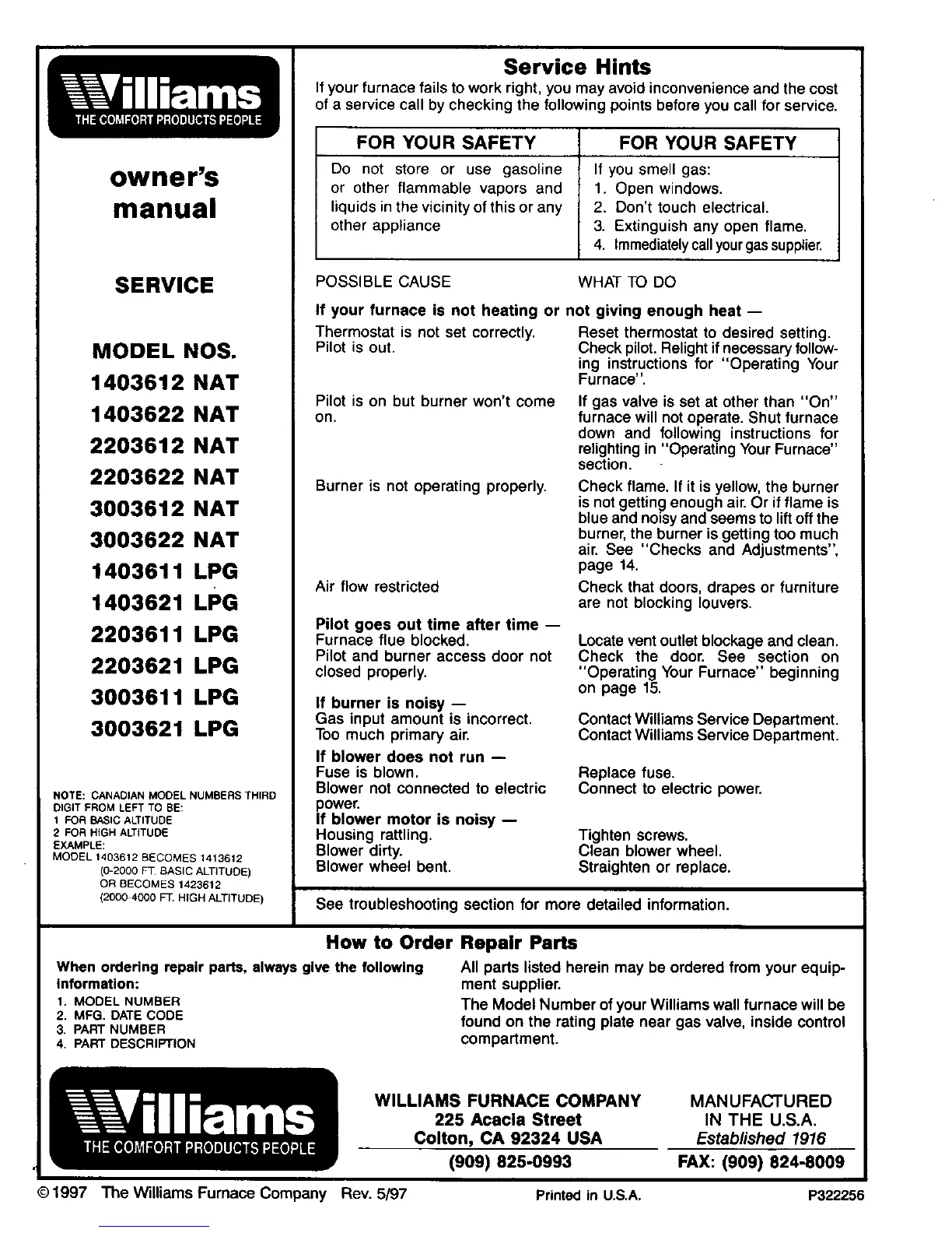 The Williams Furnace Company Rev. 5/97