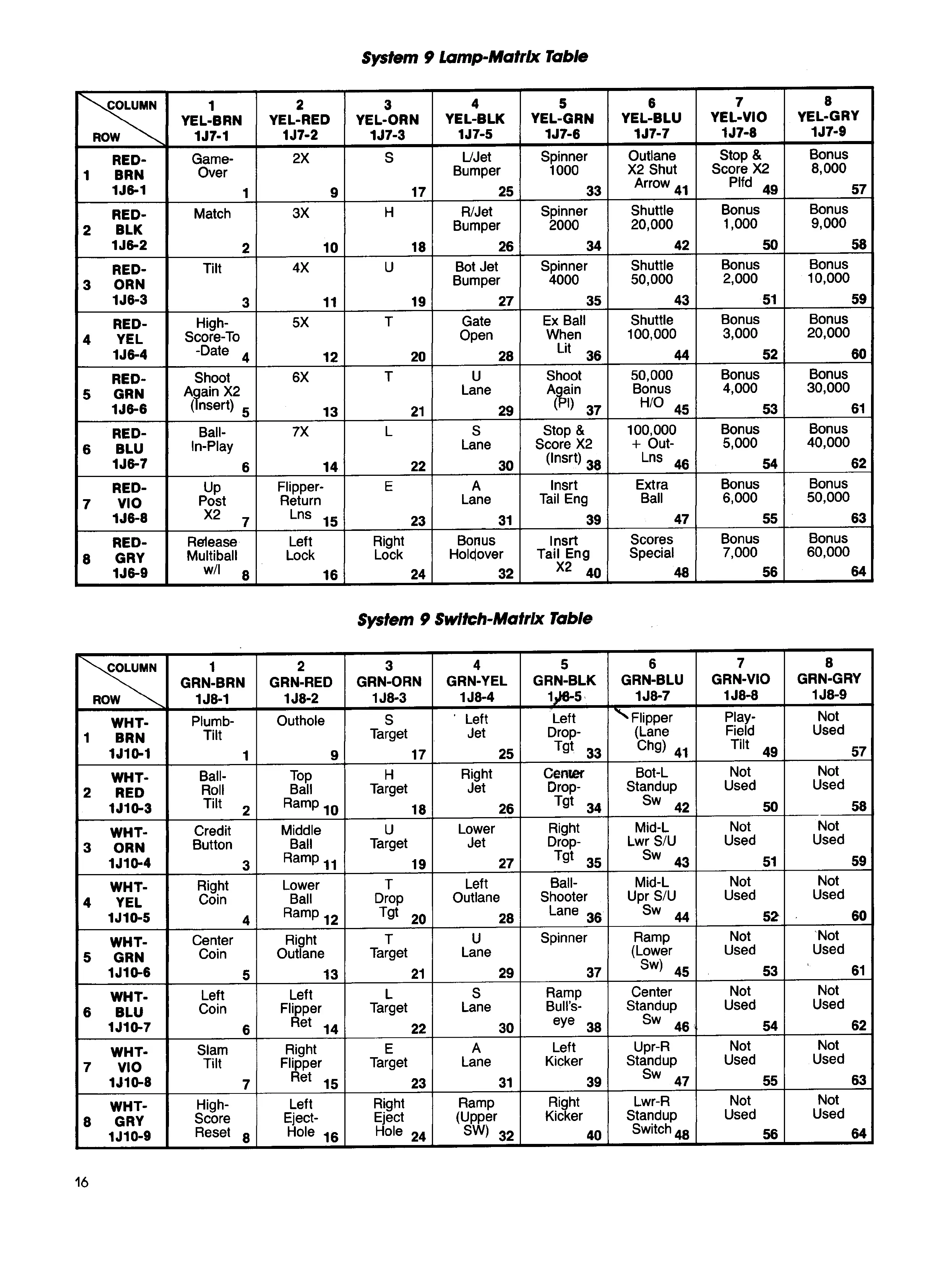 Williams SPACE SHUTTLE - System 9 Lamp-Matrix Table; System 9 Switch-Matrix Table