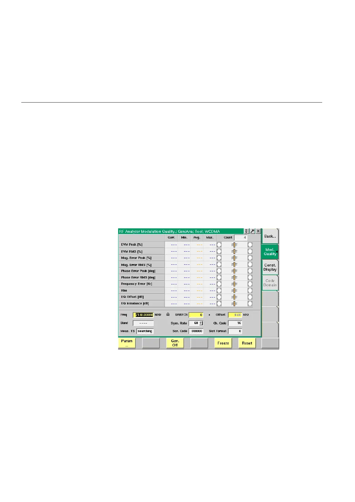 This menu displays the results of the modulation quality measurements of the RF