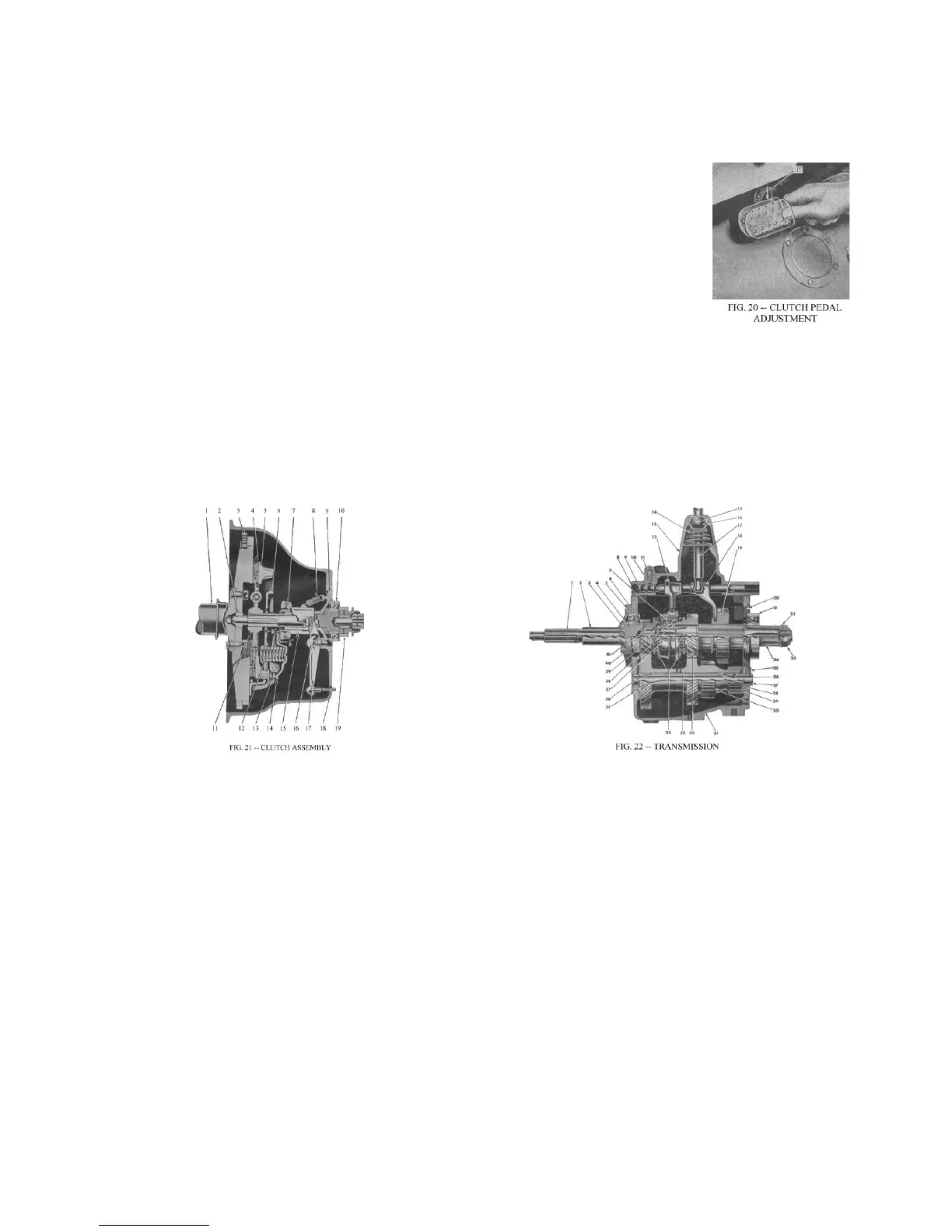release levers Fig. 21, No. 14 and the release bearing No. 7. To obtain this clearance, adjust the length of the clutch control
