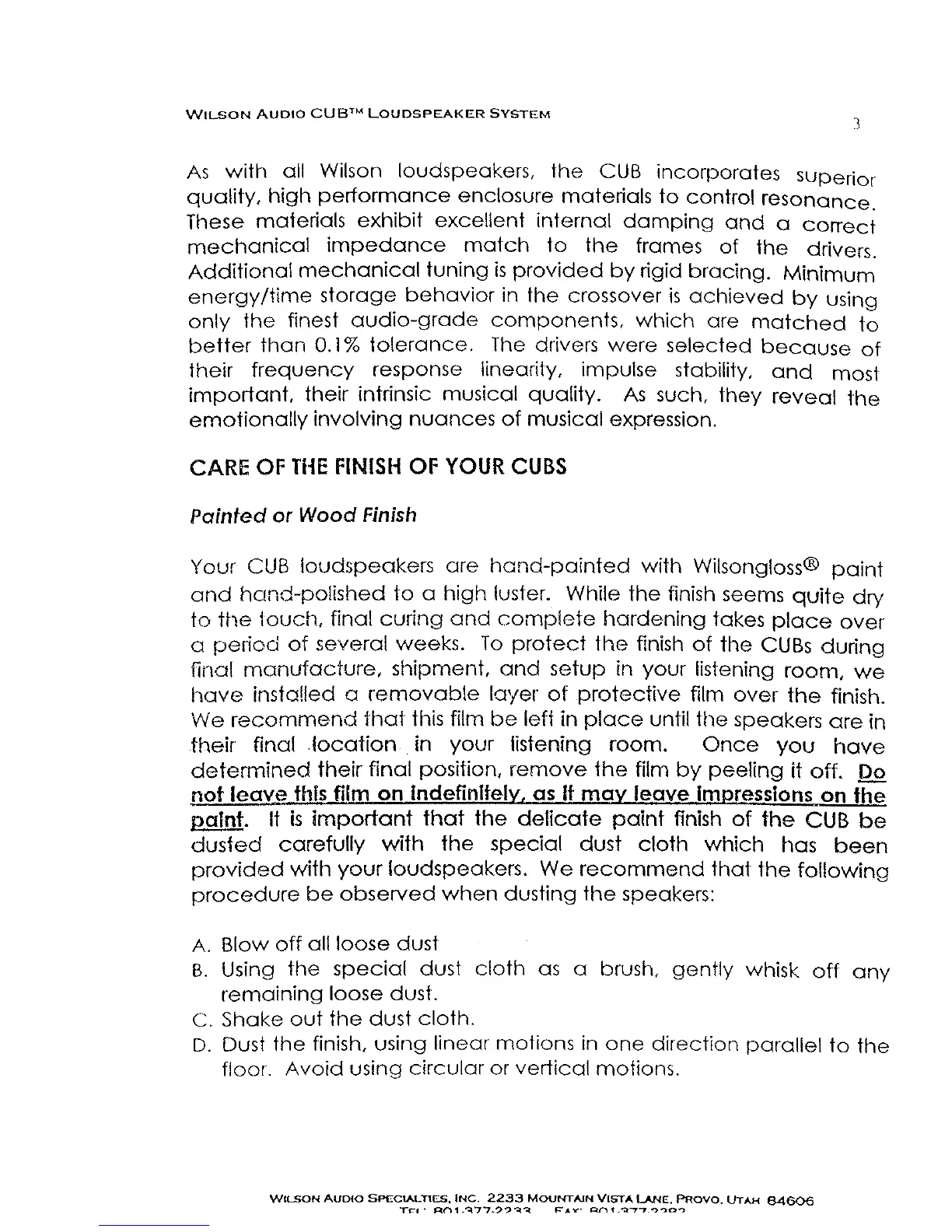 WILSON AUDIO CUB - Care of the Finish; Painted or Wood Finish