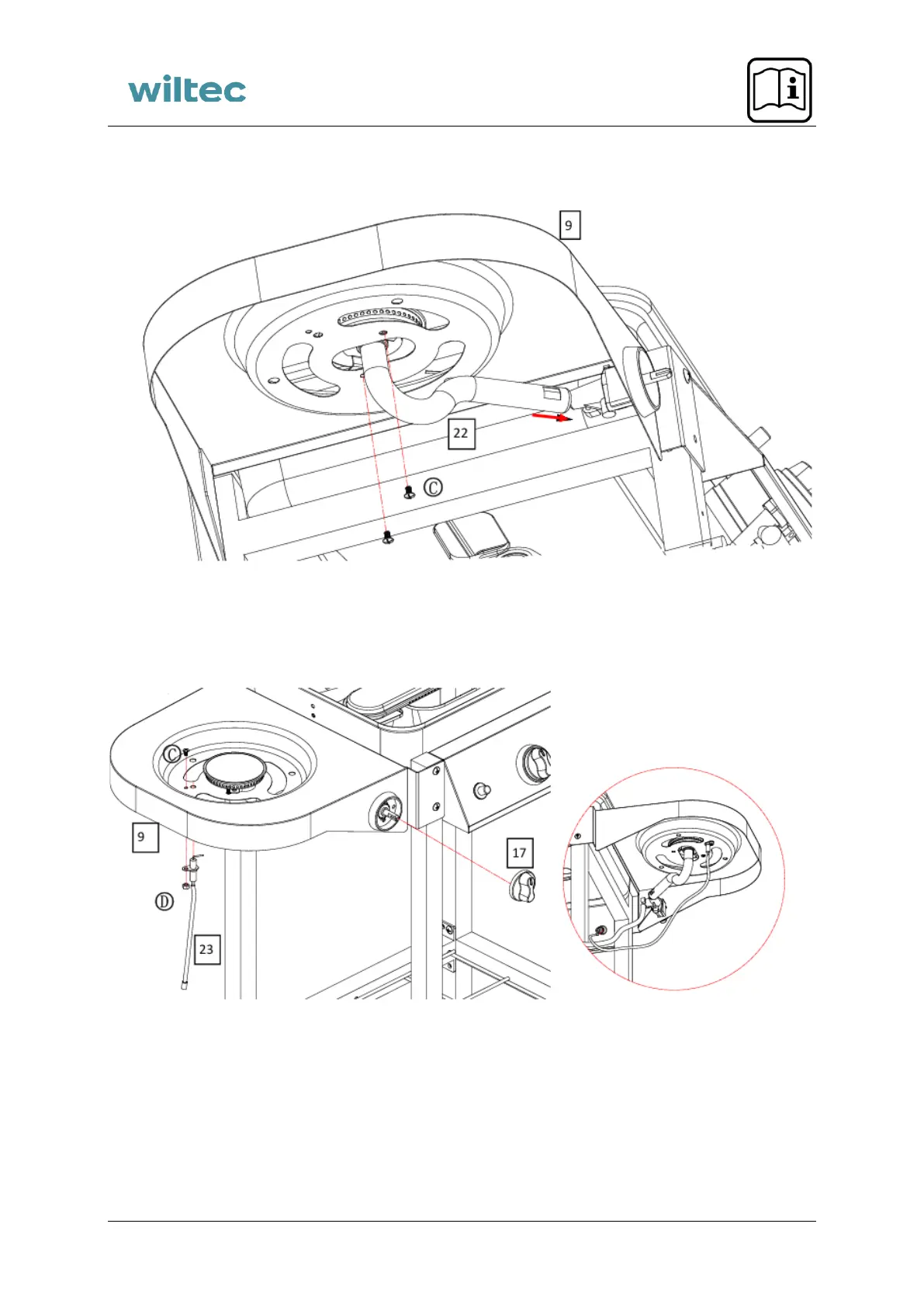 3. Then attach the side burner (22) to the side burner housing (9) using the M4×8 screw (C).