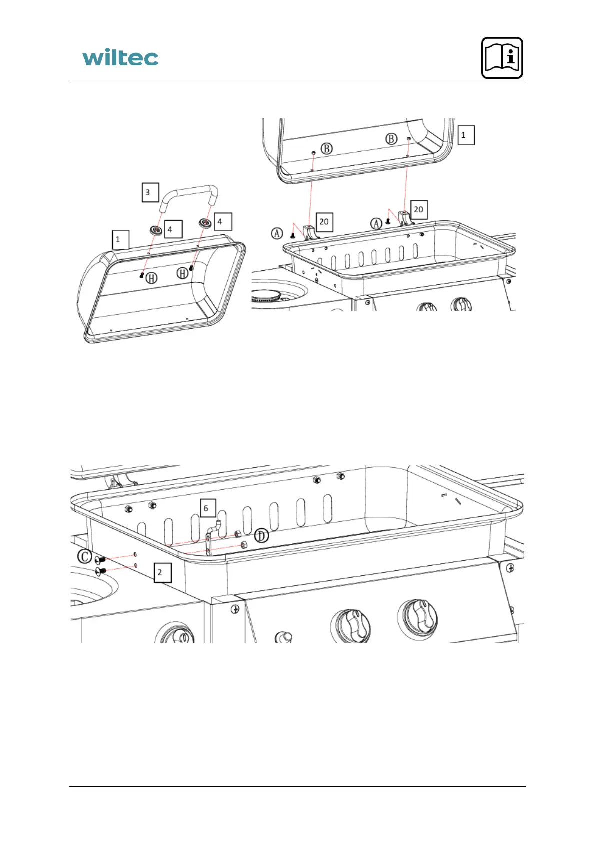 1. Attach the lid handle (3) and the handle base (4) to the lid (1) using the M6×15 screws (H).