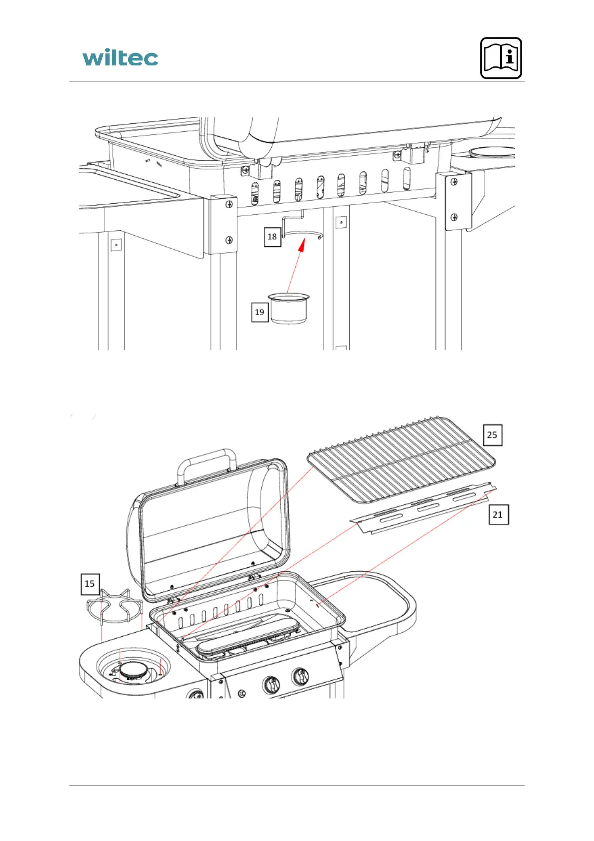 Install the pot stand for the side burner (15), the flame protection plate (21), and the grill grate (25).