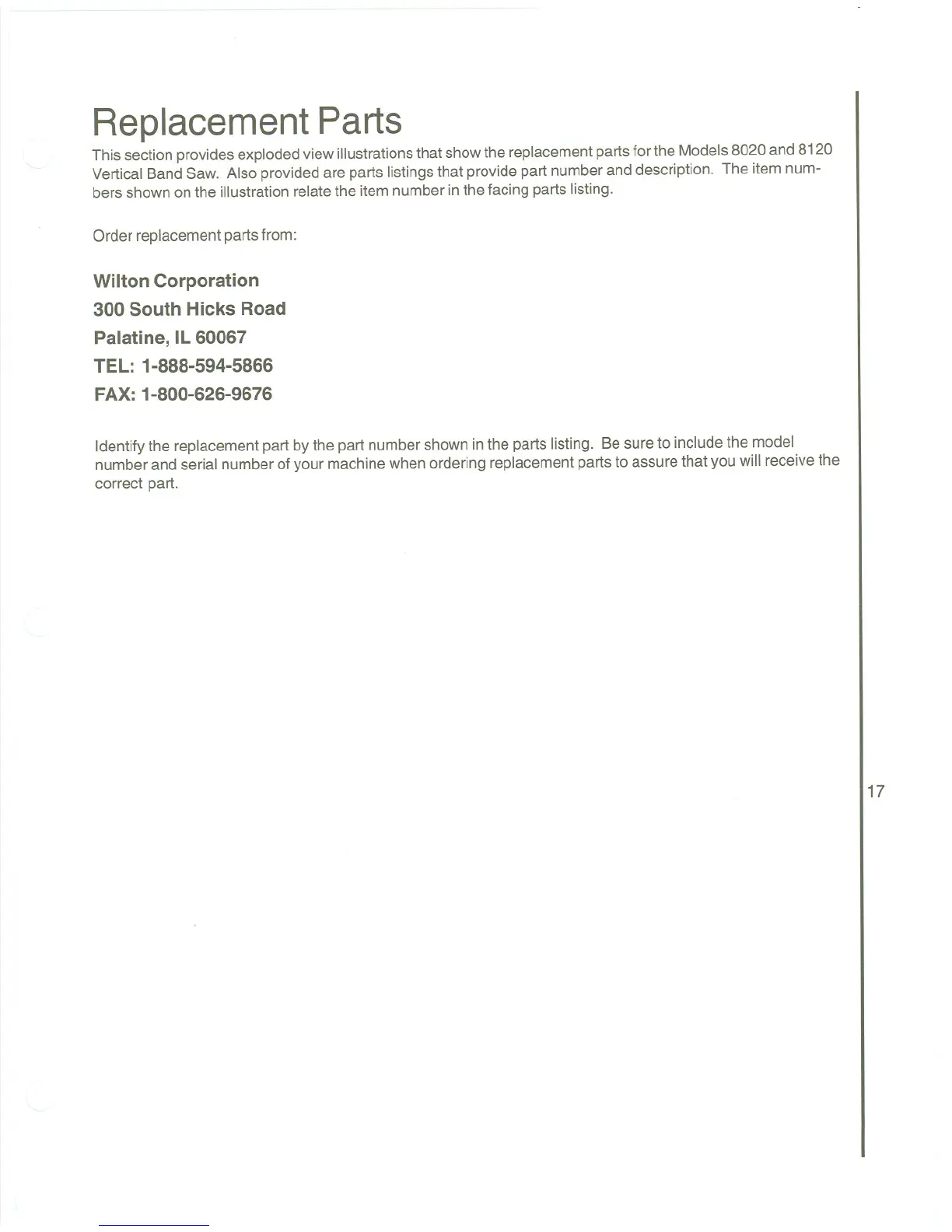 This section provides exploded view illustrations that show the replacement parts for the Models 8020 and 8120
