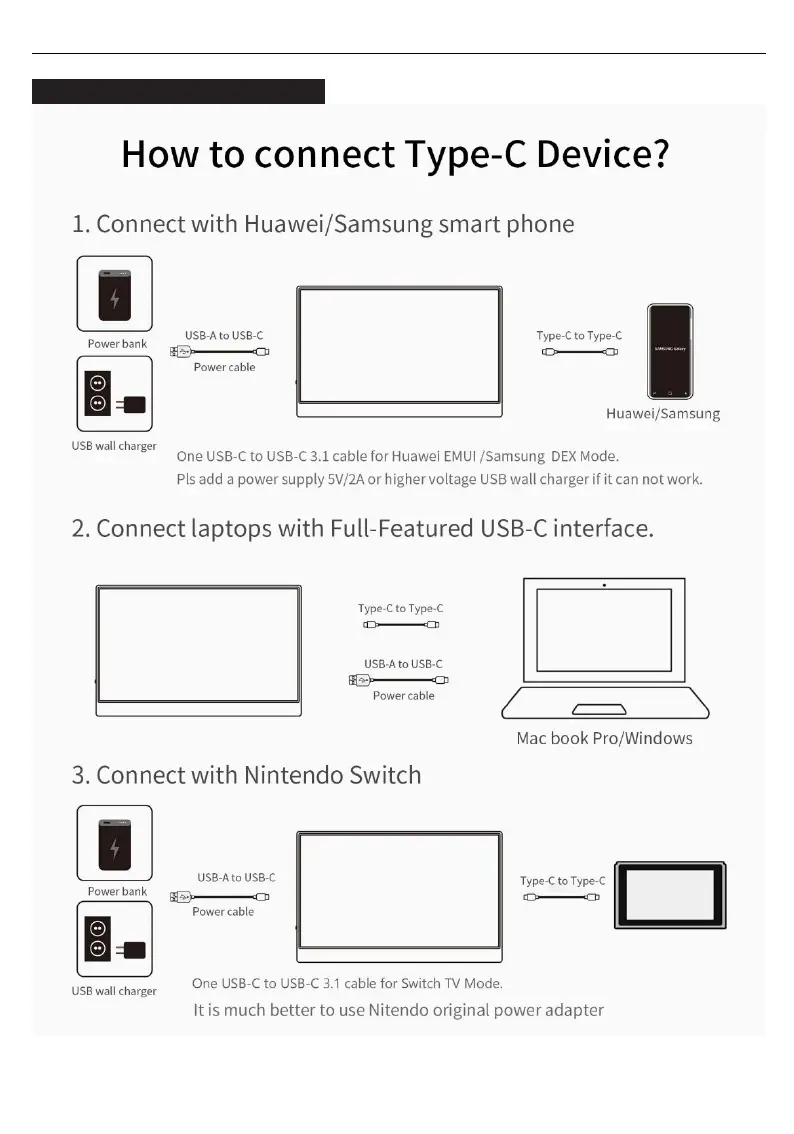 WIMAXIT M1560CTV2 - Connecting Type-C Devices; Connect to Smartphones (Huawei;Samsung); Connect to Laptops via USB-C; Connect to Nintendo Switch
