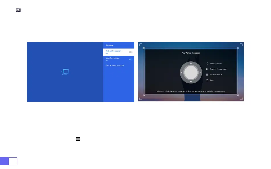 Sélectionnez le menu [ Paramètres ] - Sélectionnez l'option [ Keystone ], puis sélectionnez la [ Correction