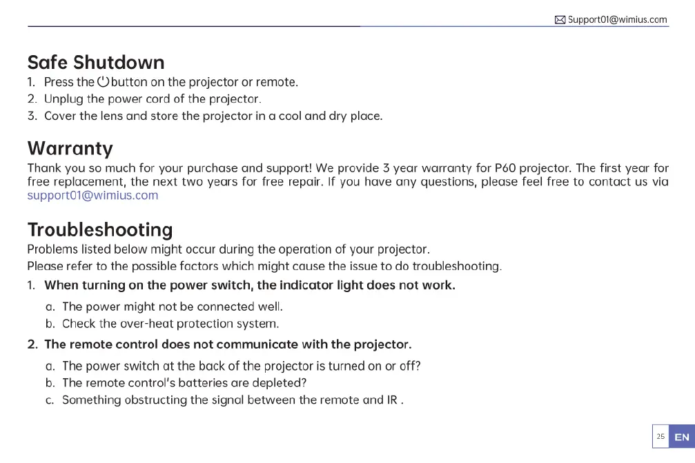 Wimius P60 - Safe Shutdown; Warranty; Troubleshooting