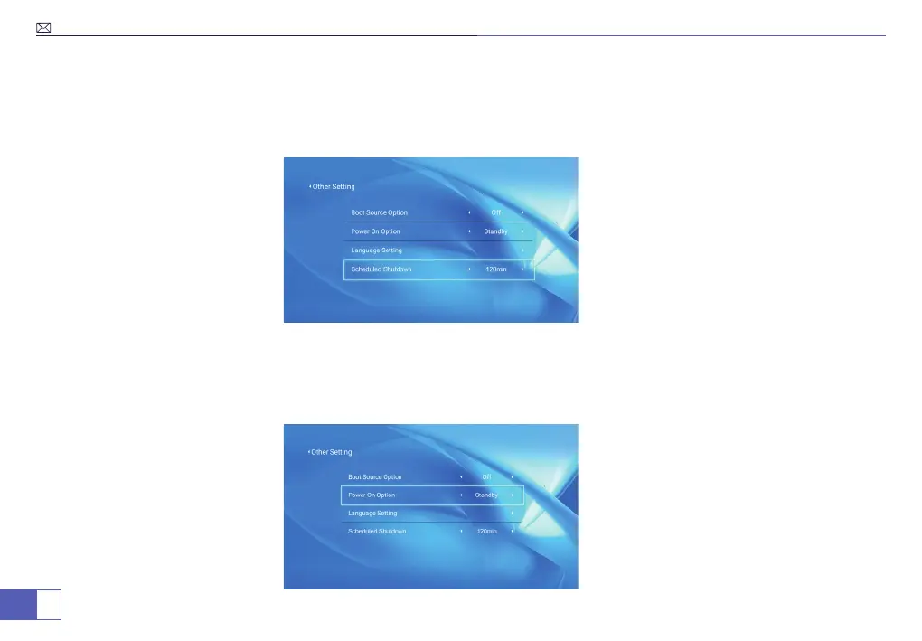 Menu>Settings>Other Setting>Scheduled Shutdown.