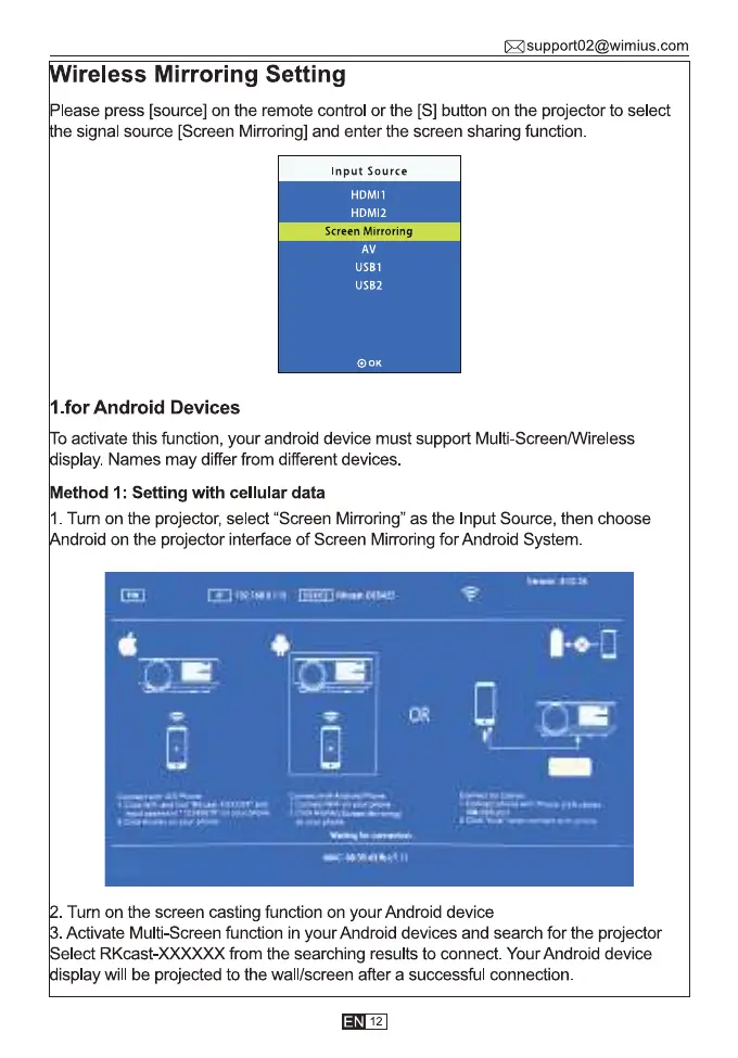 1.Tum on the projector, select "Screen Mirroring" as the Input Source, then choose